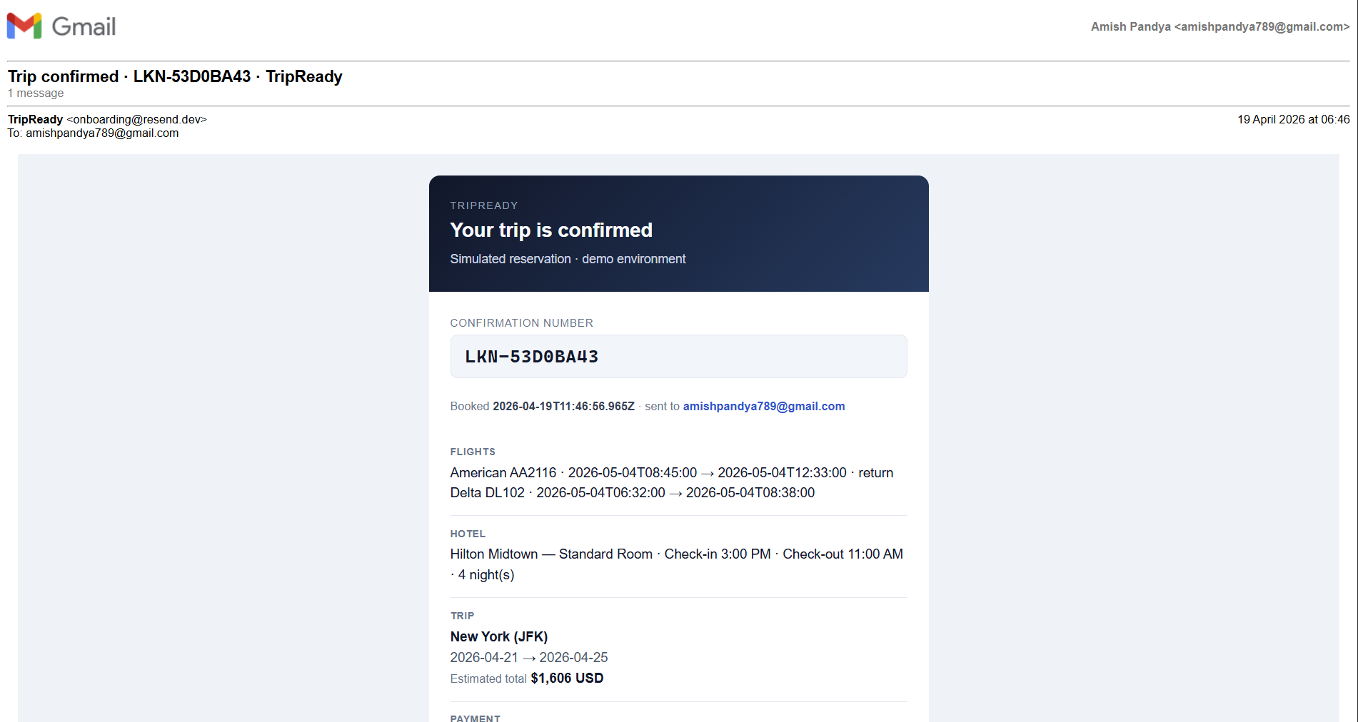 Prompt: “My trip was approved yesterday. Can you book what we selected and give me a confirmation I can forward to finance?” Situation / response: Simulated booking with confirmation-style detail (demo GDS), appropriate disclaimers that it’s not a live ticket.