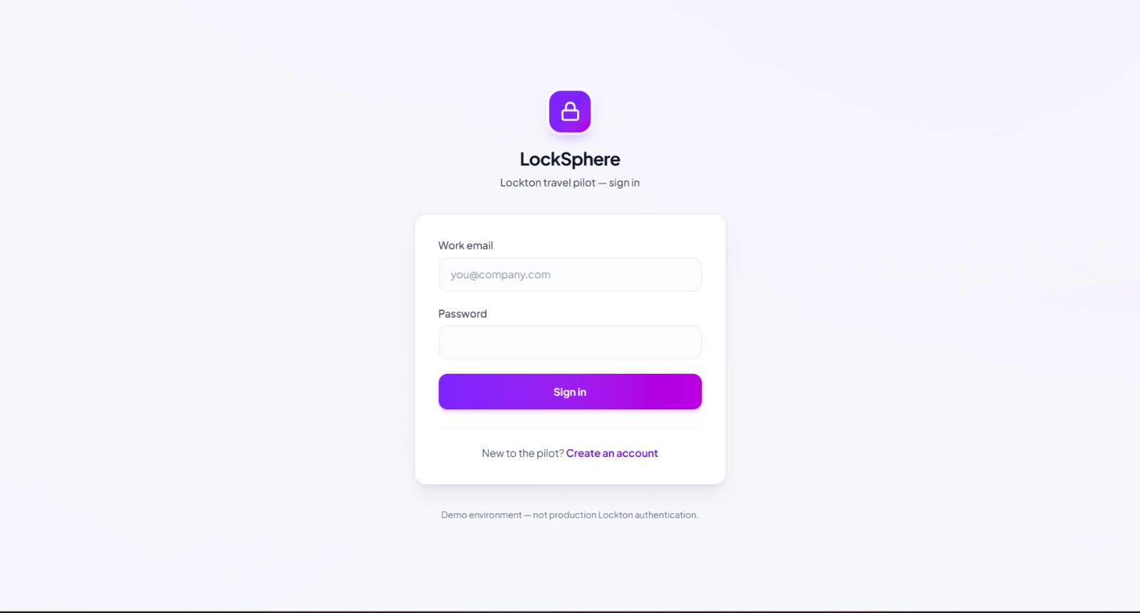 LockSphere is a demo web app for Travelers and Approvers: plan a trip on a trip card, pick flights/hotel from demo inventory, submit for approval, get approve / reject / request changes, then simulate booking with confirmation email and simulated corporate-card line items. Travelers can move through on-trip, issues (rebook), and post-trip (recap, receipt-style expense extraction, email handoff to a People Leader).