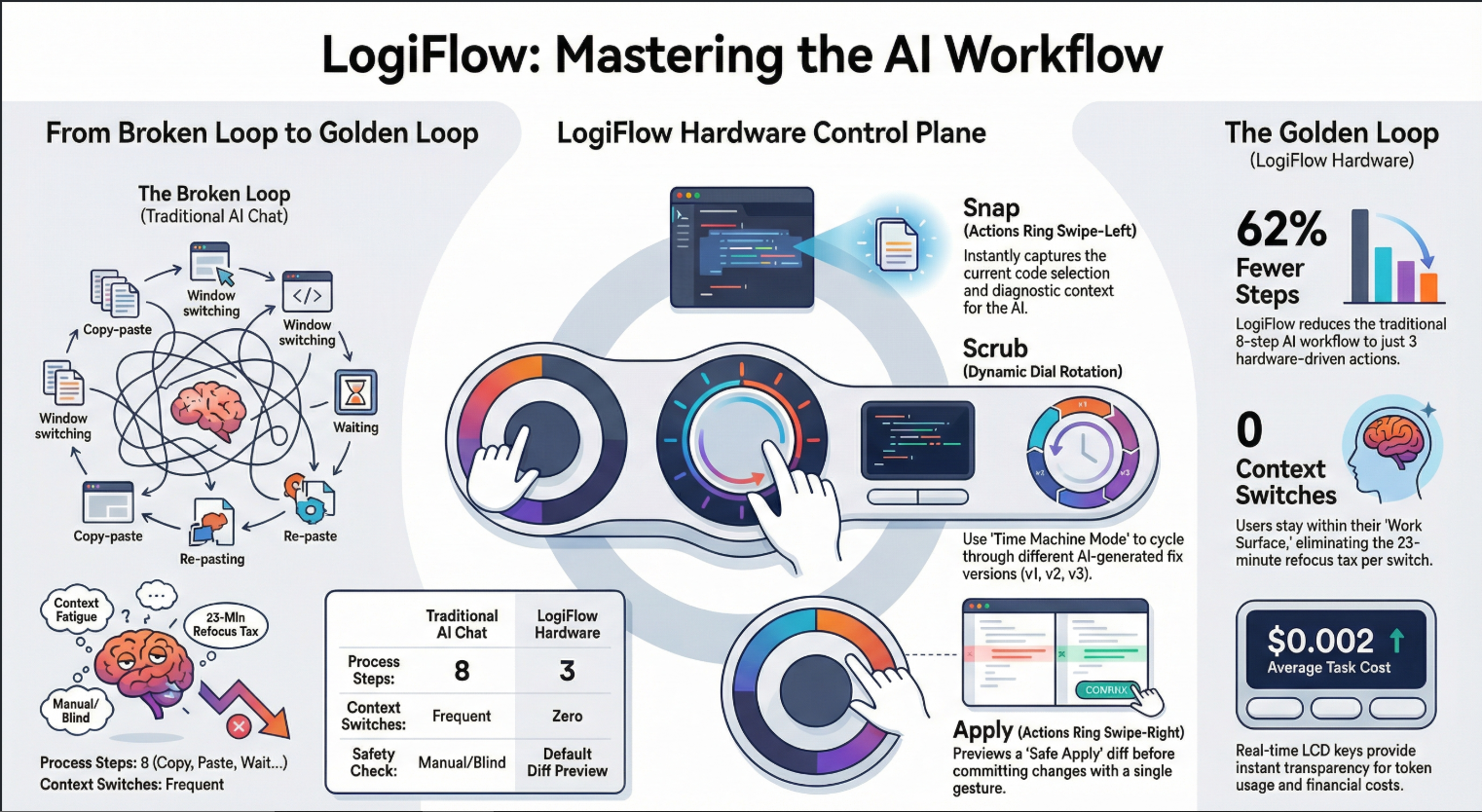 The interface layer matters as much as the AI layer. A slightly worse model with a dramatically better interaction model will win every time. LogiFlow isn't about making Claude or GPT smarter it's about making the loop between human and AI so fast and trustworthy that developers stop thinking of AI as a tool and start thinking of it as a collaborator that lives in their hands.