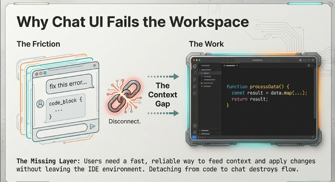 Every developer using AI today lives in a broken loop: copy → paste → prompt → wait → interpret → apply → pray it doesn't break anything. Each context switch out of your IDE costs 23 minutes of refocus time. We weren't building slower we were spending all our energy managing AI instead of building with it.