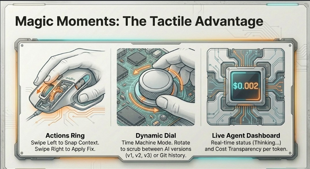 The haptic confidence layer. This is the moment in every demo where people go quiet. Feeling a stiff scroll wheel on a low-confidence AI suggestion without reading a single word is genuinely new. We don't know of any other tool that expresses AI uncertainty through physical resistance.