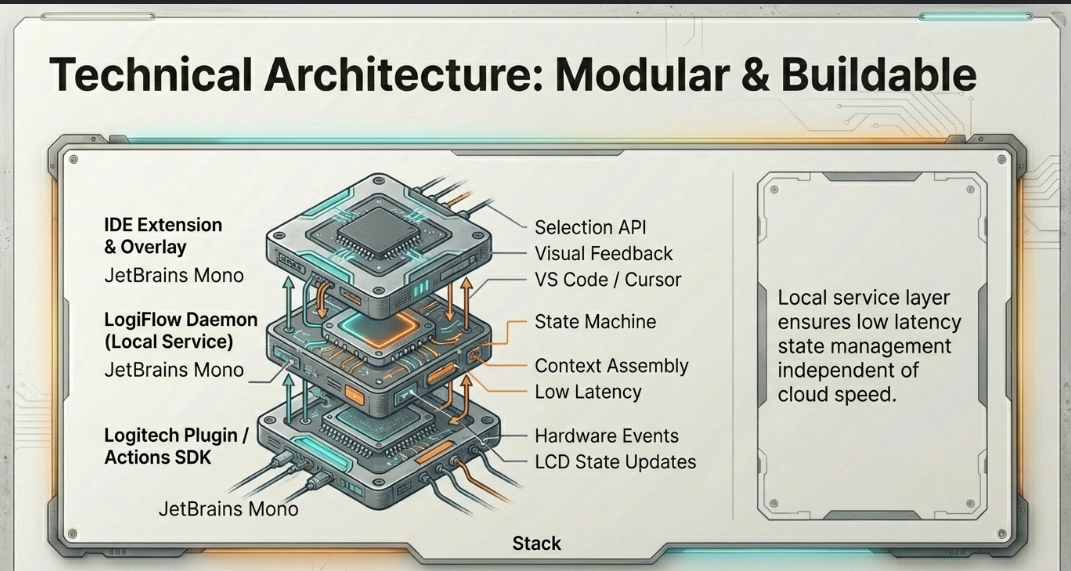 [Logitech Plugin] ←→ [LogiFlow Daemon] ←→ [IDE Extension] ←→ [Overlay UI]