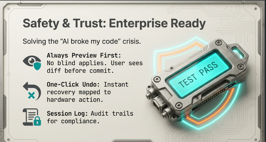 Every change shows a diff preview before committing. One hardware button undoes the last apply instantly. A session log tracks every context and change — auditable, private, always reversible.