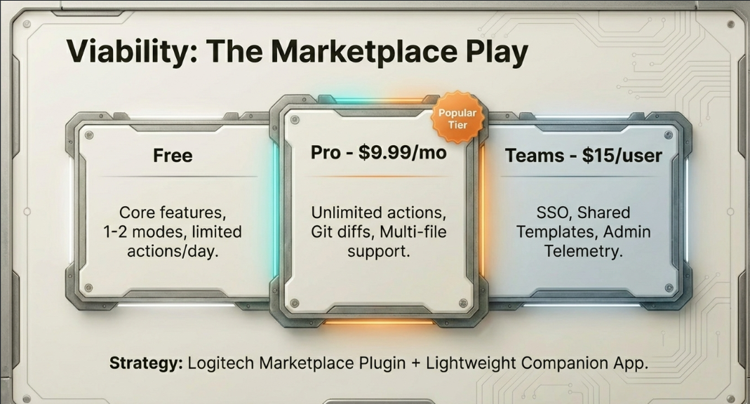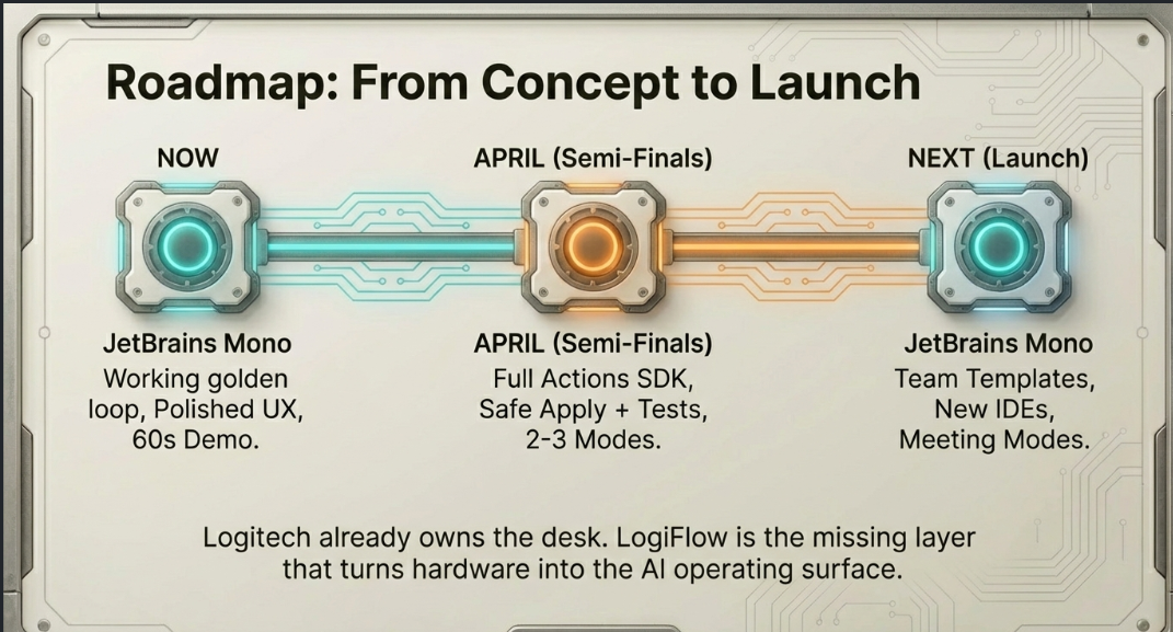 The roadmap goes far beyond code: meeting modes that snap the last 30 seconds of audio as context, writing assistants for docs and reviews, and a LogiFlow SDK that lets any application plug its own AI actions into the ring.