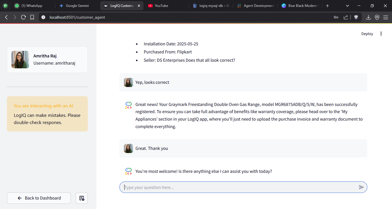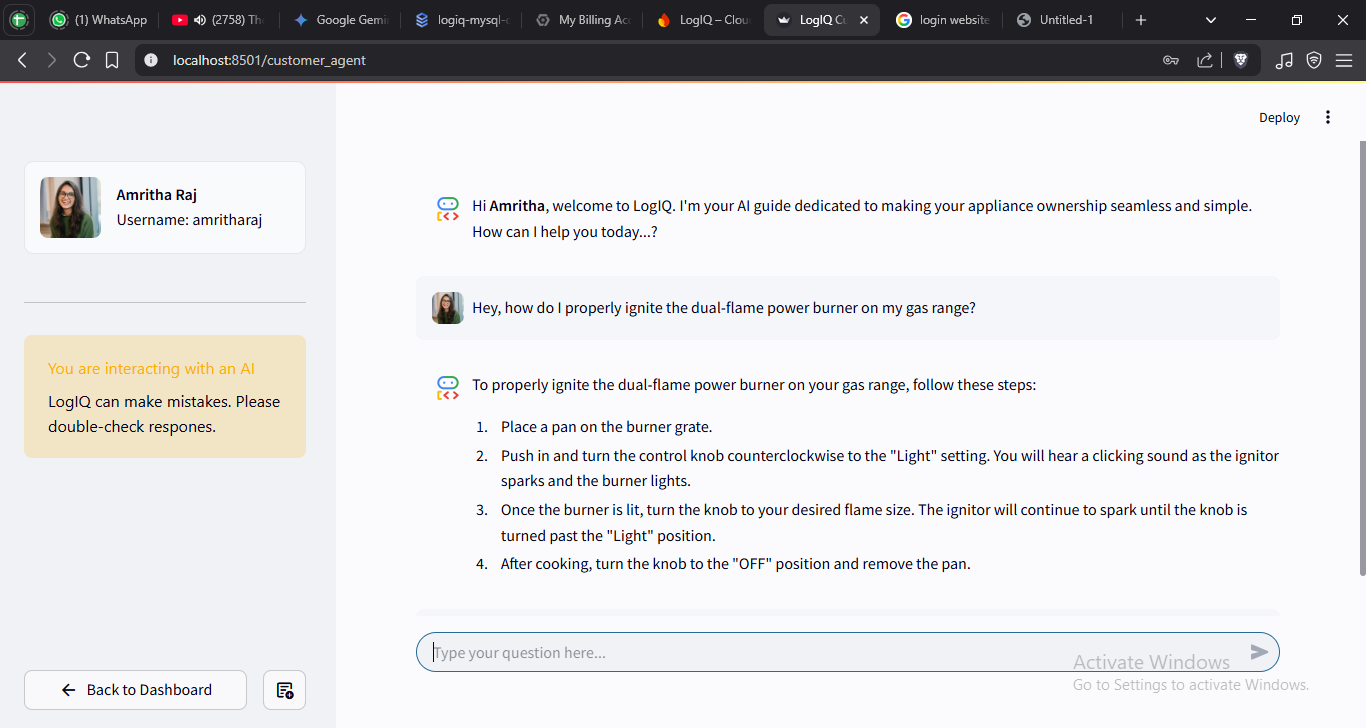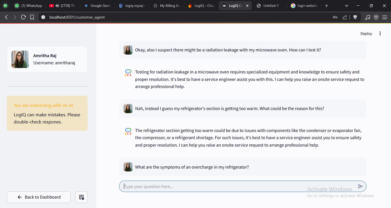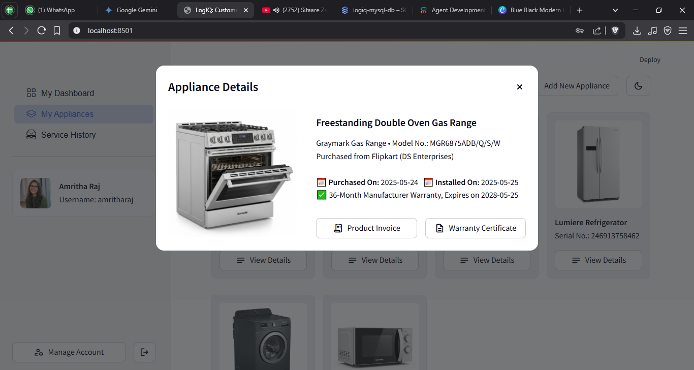 This project showcases LogIQ - a fictional home appliance manufacturer that offers an AI-powered application to help customers seamlessly manage their household devices. At the core of the app is a smart assistant—an AI chatbot that helps users manage their registered appliances, raise service requests, and look up information about appliance care and maintenance. The chatbot integrates seamlessly with the app, allowing users to interact with its features manually through the interface or switch to AI mode for a guided, chat-based experience.