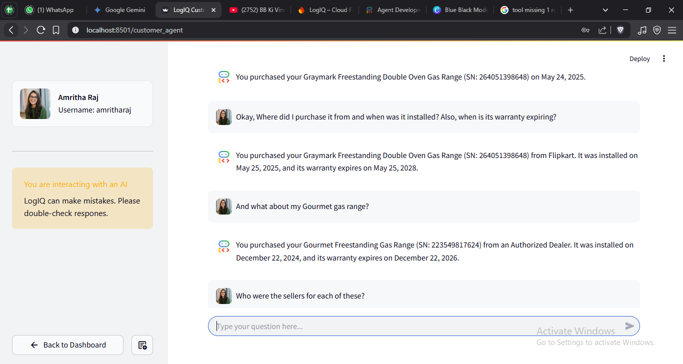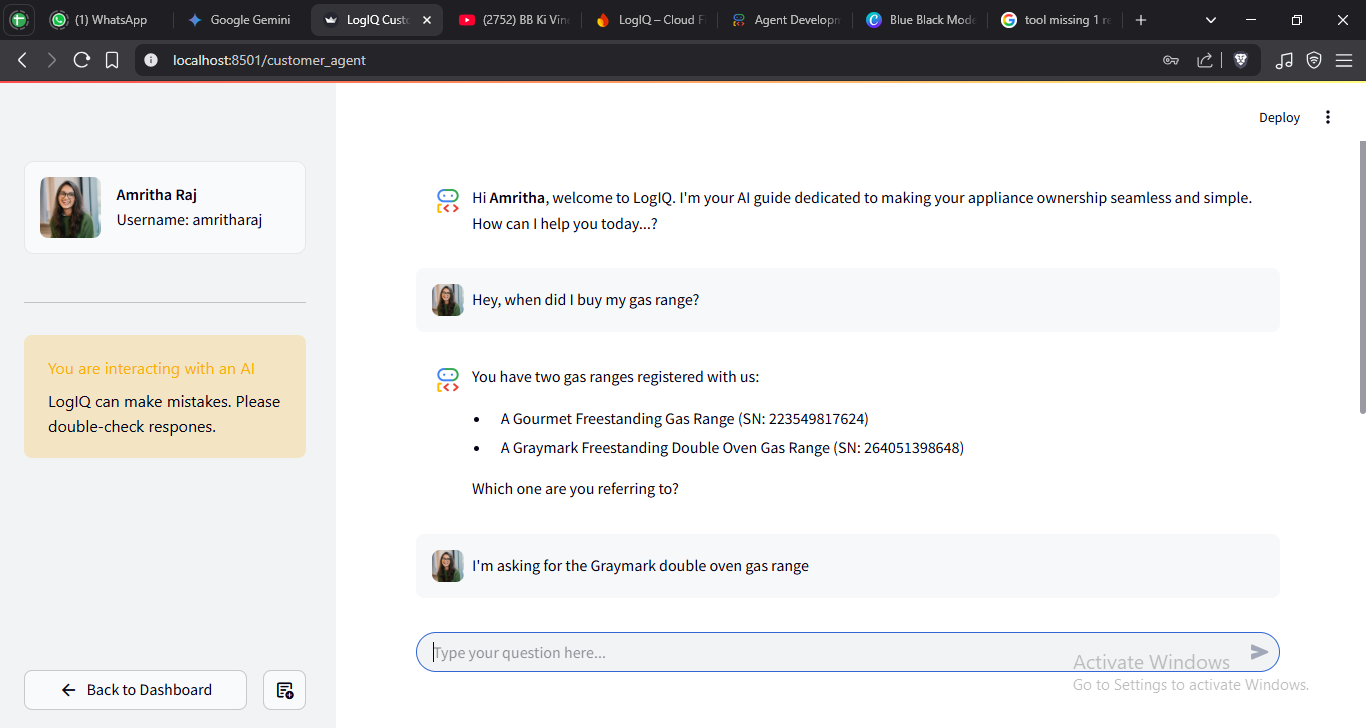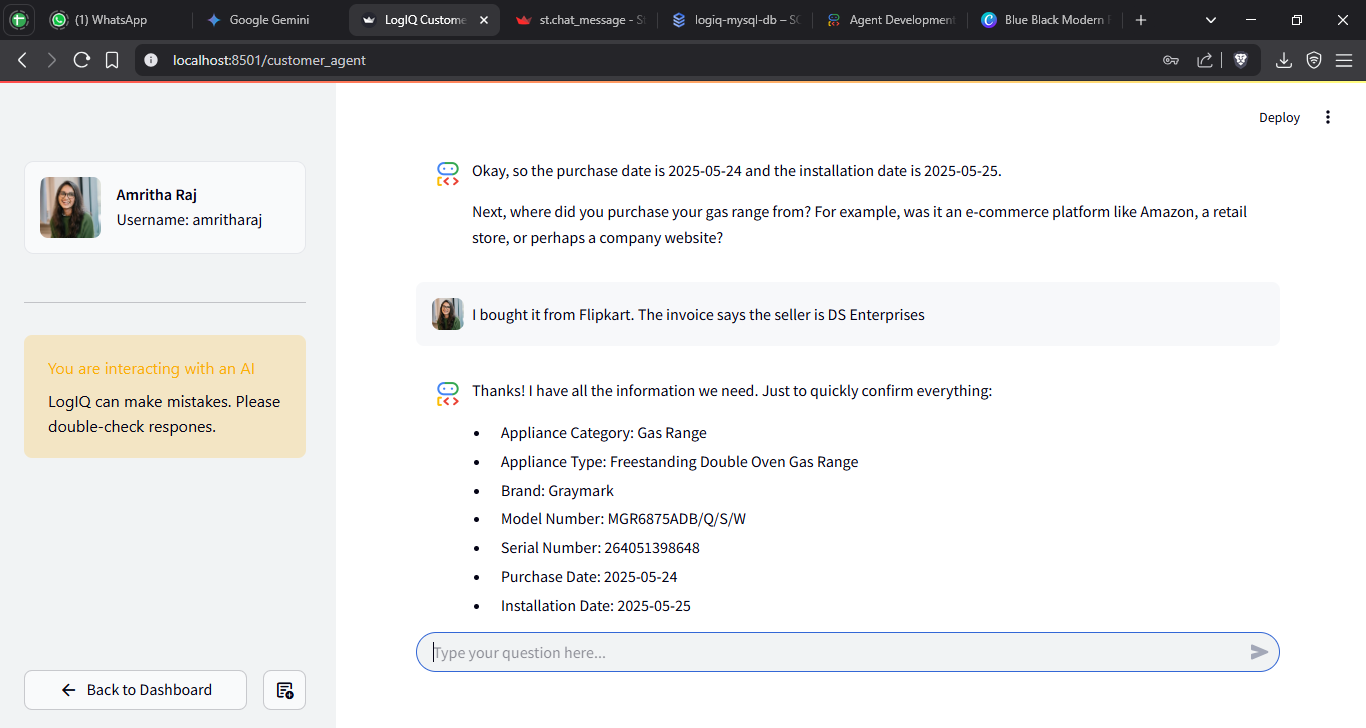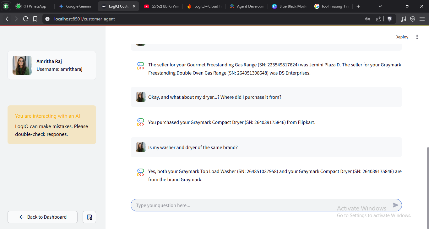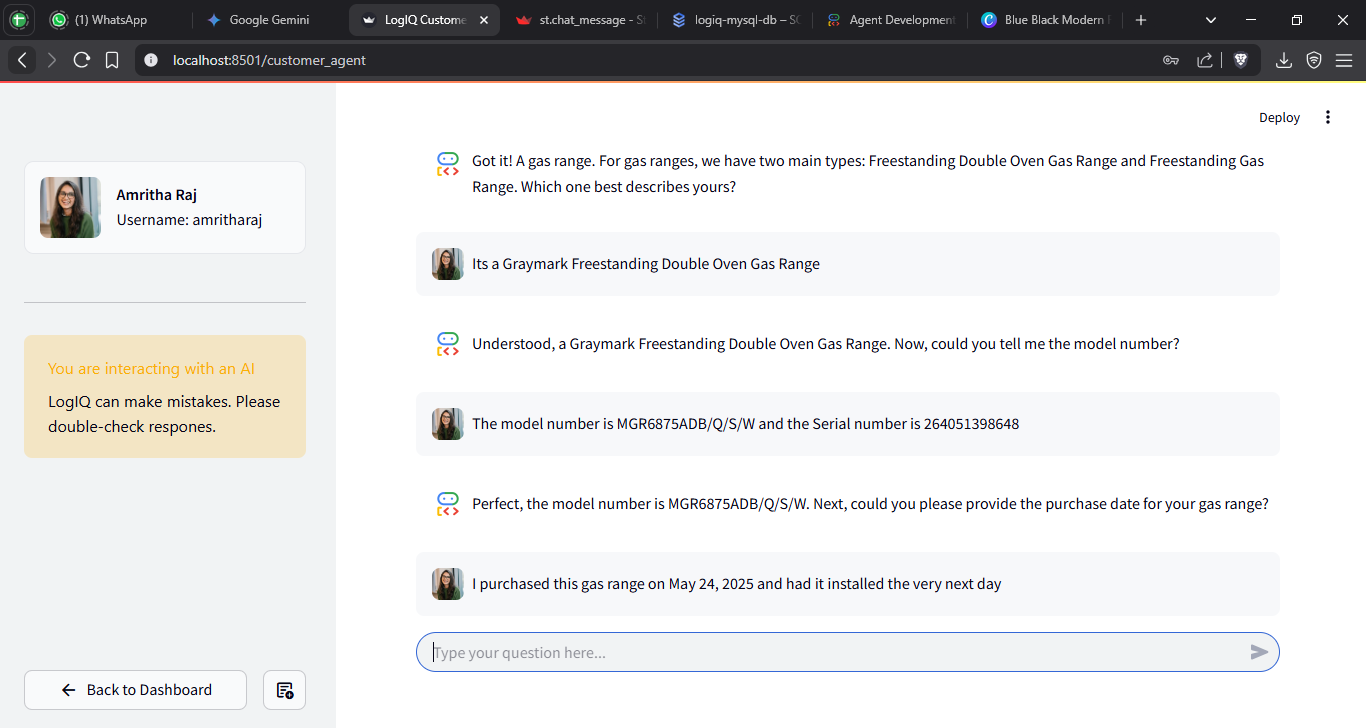 LogIQ's customer agent is a multi-agent system designed to streamline home appliance management and customer support. It use Google Agent Development Kit (ADK) to enable intelligent context-aware interactions across agents. These agents then collaborate to interpret the input query, retrieve relevant data, and deliver task specific responses.