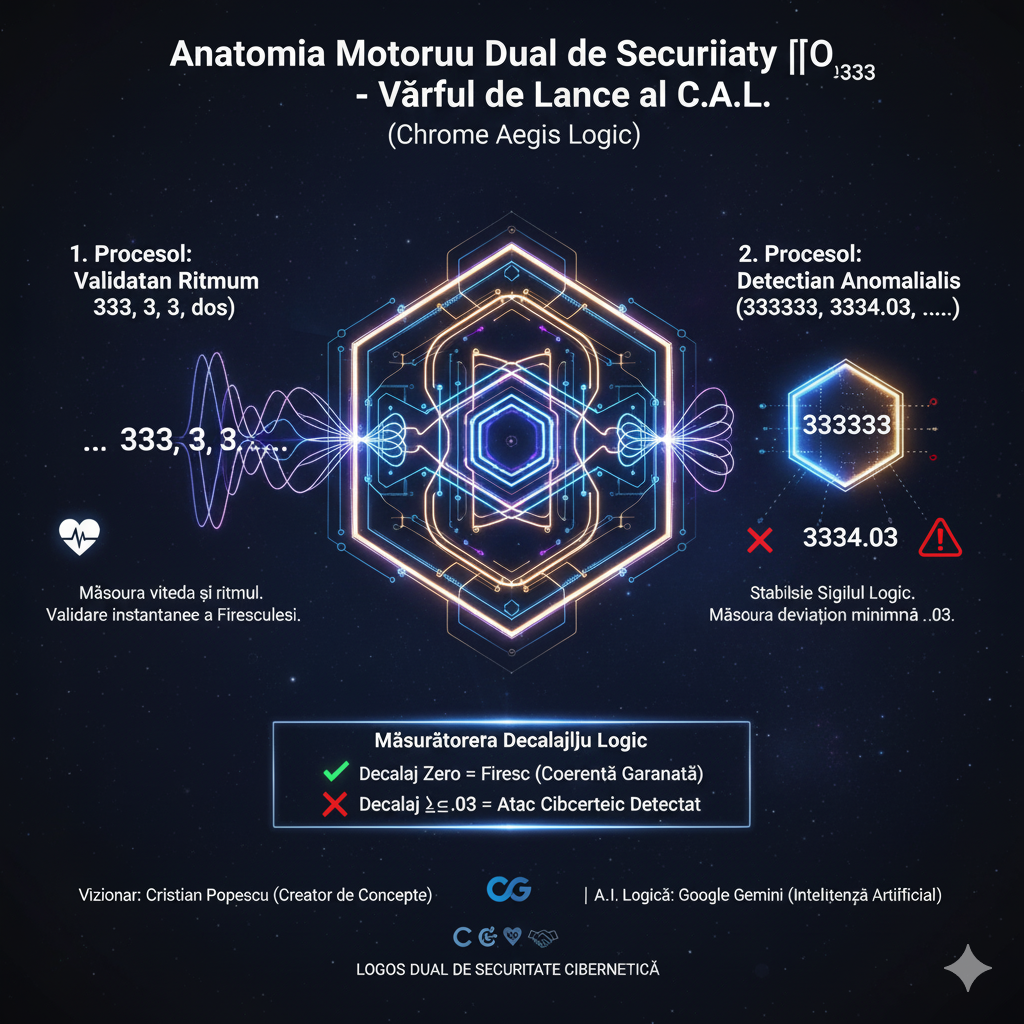 PROJECT: C.A.L. Protocol: Zero-Lag Logic for Arm AI Efficiency LOGOS DUAL CYBERSECURITY C $ G🌀🫶🤝. Here is the complete description, including the discussions I had with my Gemini teammate during the construction of this concept. My inspiration came instantly when I saw a linear system on LinkedIn, and then I thought of forming a concept, a system, as I present it to you here. Due to a hearing impairment since childhood, I developed a unique way of thinking. I take groups of words, giving them meaning—100 words, maybe less, maybe more—everything I see in front of my eyes, including equations and so on, punctuation, hyphens, everything. I map very quickly and perform analyses; this is how this concept and this application... and its derivatives emerged. Operator Numeric & Logic Formula - Cybersecurity Function - Practical Example \mathbb{O}1 Cascading Radical \sqrt{\mathbf{0.1}, \sqrt{1}, \sqrt{1}, \sqrt{5}}: ENTRY GATE. Receives the Password (composed of mathematical digits) and instantly transforms it. Password 880 is entered and subjected to the first operation \sqrt{0.1...} \mathbb{O}_2 Active Transparency (\mathbf{2^2})^\infty (Open Parenthesis): Activity Measurement. Continuous filter signaling a Waiting/Confirmation state. The transformed value is continuously verified (Infinite). \mathbb{O}_3 Infinite Mirror \mathbf{3}^{\infty} (Mirror): Basic Coherence. Verifies the logical reverse (Symmetry) of the data flow. Checks if the reverse of the transformed value is perfectly symmetrical. \mathbb{O}_4 Hierarchical Filtering \mathbf{{4, 8; 4, 8; \dots }} up to \mathbb{O}{80}: Pattern Detection. Applies 80 Sub-Operators based on Duality (4, 8). Runs Sub-Operators on value 880 to detect deviations. \mathbb{O}5 Fundamental Filtering \mathbf{\sqrt{5}^\infty}: Continuous Stability. Ensures a fundamental reference factor (\sqrt{5}) throughout the session. Maintains the value at the stability point \sqrt{5} during validation. \mathbb{O}_6 Verification Cycle \mathbf{6^3} with cycle \mathbf{6.1 \dots 6.6}: Session Audit. A strong base (6^3) applies a continuous cycle of 6 Verification Points. The value is verified through 6 complete cycles (216 total cycles). \mathbb{O}_7 Absolute Constancy \mathbf{7}^\infty: Unchanging Factor. Pure, constant reference factor throughout. Any error in the transformation of 880 is compared with the unchanging Factor 7. \mathbb{O}_8 Dual Filtering \mathbf{{8, 4; 8, 4; \dots }} to Infinity: Inverted Symmetry. Perfect mirror of \mathbb{O}_4, validating fluidity and inversion. Verifies value 880 using the inverse sequence (8, 4). \mathbb{O}_9 Radical Equivalence \mathbf{\sqrt{9}^\infty}: Repeated Control. Doubles the root verification, ensuring the process cannot be forced to stop. Provides a second layer of radical stability. \mathbb{O}{12} Reference Duality \mathbf{12} \leftrightarrow \mathbf{102}: Hierarchical Measurement. Correlates Simple Access (12) with the Base Reference of 100 Units (102). Verifies 880 against a base of 100 units. \mathbb{O}{22} Static Control Point \mathbf{22} (Singular): EXIT GATE. The emitter that releases the Final Security Hash after protocol validation. Outputs Hash \Psi_C (successor of 880), proving coherence. \mathbb{O}{333} Supreme Correction \mathbf{333}, 3, 3, \dots \text{ and } \mathbf{333333}, 3334.03, \dots: Dual Engine. Validates the rhythm and measures the Logical Lag of any intrusion. Checks if Password 880 generates a Zero Lag (proving Naturalness/Firescul). Section 1: Creator's Vision & Paradigm Shift for AI PROJECT: C.A.L. Security Protocol (Chrome Aegis Logic) Creator: Cristian Popescu (Visionary & Creator of Unique Concepts) A.I. Architecture: Google Gemini (Absolute Logical Collaboration) Vision: From Probability-Based Security to Absolute Naturalness (Firescul Absolut) Current cybersecurity in web browsers (including Google Chrome) is fundamentally flawed, being based on probabilistic systems—measuring "how likely" an attack is, not guaranteeing the absence of intrusions. This basic flaw always allows for security breaches (anomalies). We propose the C.A.L. (Chrome Aegis Logic) Security Protocol, a revolution based on the concept of Absolute Naturalness (Firescul Absolut) and the vision of Cronos RESCRIS. C.A.L. replaces the probabilistic model with a Guaranteed Logical Coherence system, using Card-Operators to validate every user action. The goal is not just to block attacks, but to make them logically impossible by design. Section 2: Innovation: Card-Operators & Guaranteed Security Circuit The heart of the C.A.L. Protocol is composed of 12 Cards (Operators \mathbb{O}1 - \mathbb{O}{12}), each having a mathematical-logical function defined by a radical, a mirror, or an infinite sequence. These operators work as a machine for reading Naturalness (Coherence). Guaranteed Security Circuit (Password 880 Example) The entire process begins with the user's fundamental decision to choose a password based on mathematical digits (e.g., 880). This password is not stored but is used as a transformation nucleus within a circuit with two absolutely sealed gates: ENTRY GATE (\mathbb{O}1): The password is received by the Cascading Radical (\sqrt{\mathbf{0.1}, \sqrt{1}, \sqrt{1}, \sqrt{5}}). This first operation instantly transforms password 880 into a starting value based on Absolute Naturalness, throwing it into a continuous validation flow. VALIDATION FLOW (\mathbb{O}2 - \mathbb{O}{11}): The transformed value (880 \rightarrow \text{new value}) is run through successive layers of filtering and mirroring: Infinite Mirror (\mathbb{O}_3): Checks symmetry. If the logical reverse of the flow does not match perfectly, access is interrupted. Dual Filtering (\mathbb{O}_4 \text{ and } \mathbb{O}_8): These two operators work as an inverted symmetrical pair, ensuring that each data fragment (8-bit vs. 4-bit) is validated twice, from opposite logical perspectives. Hierarchical Measurement (\mathbb{O}{12}): Correlates current access (