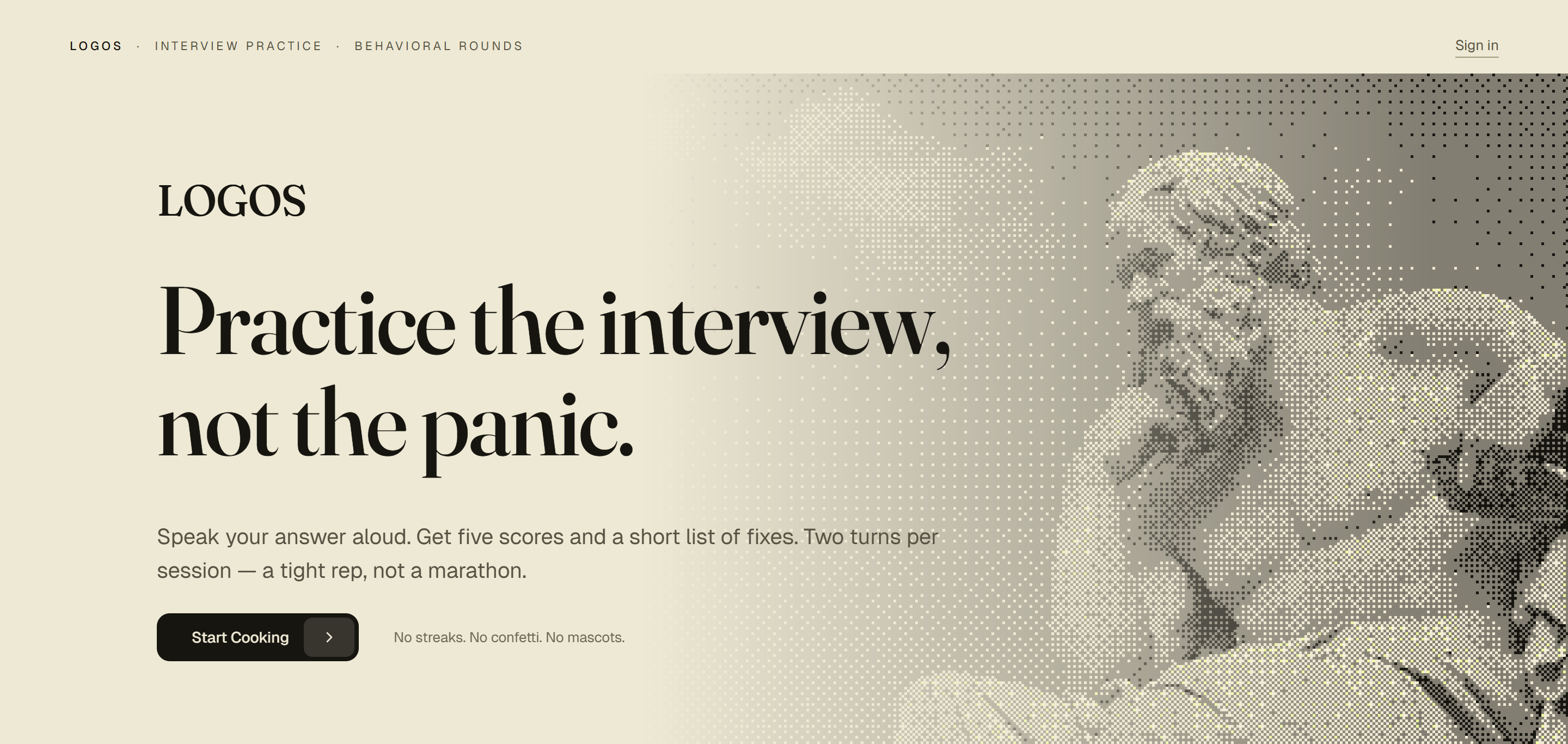 Logos exists to give that rep, on demand, in a quiet workspace that treats the candidate as an adult. Voice in, transcript out, an interviewer that asks a real follow-up to your actual answer, scored on the dimensions interviewers actually care about, with a delivery grade pulled from your webcam.