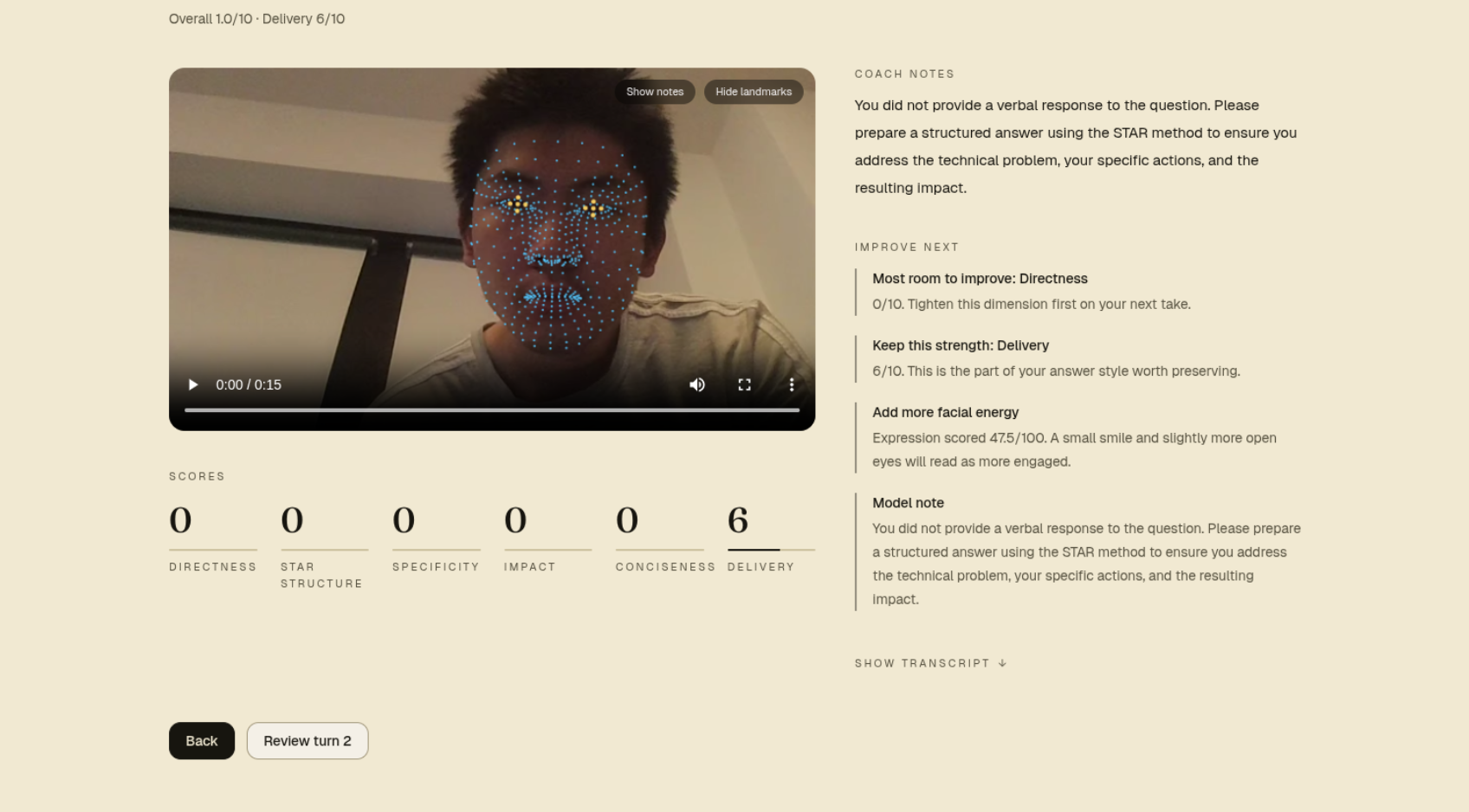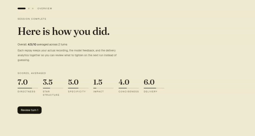 - Five LLM-scored dimensions: Directness, STAR structure, Specificity, Impact, Conciseness.
