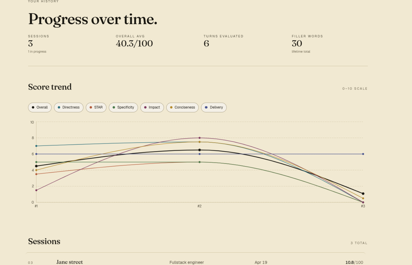 GET /sessionsreturns the candidate's completed sessions with cached per-dimension averages, so the history page renders an inlinerechartstrend chart of all six dimensions over time without N+1 fanout.GET /sessions/{id}returns the full per-turn breakdown — transcript, scores, feedback, filler-word table, replay metadata.GET /me/statsreturns user-level rolling aggregates (total sessions, rolling averages, total filler count) for the profile strip.- A dedicated