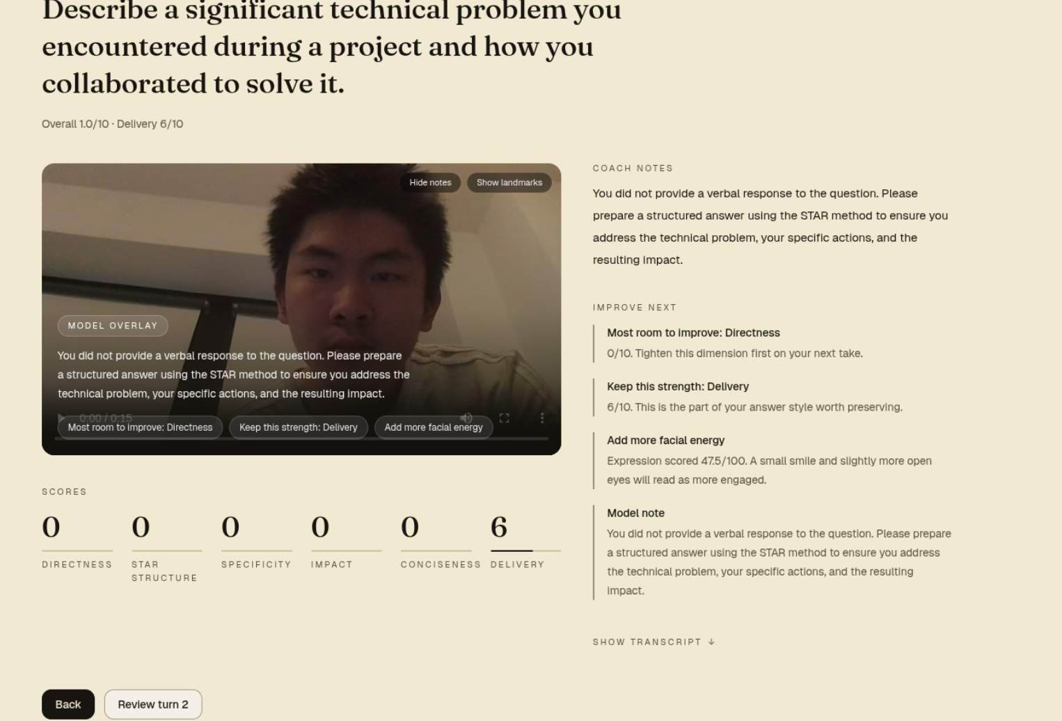 We built an AI-powered behavioral interview coach. Speak your answer, get a tailored follow-up question and rubric-based scoring in the same flow you'd get from a real interviewer — including how you came across on camera.