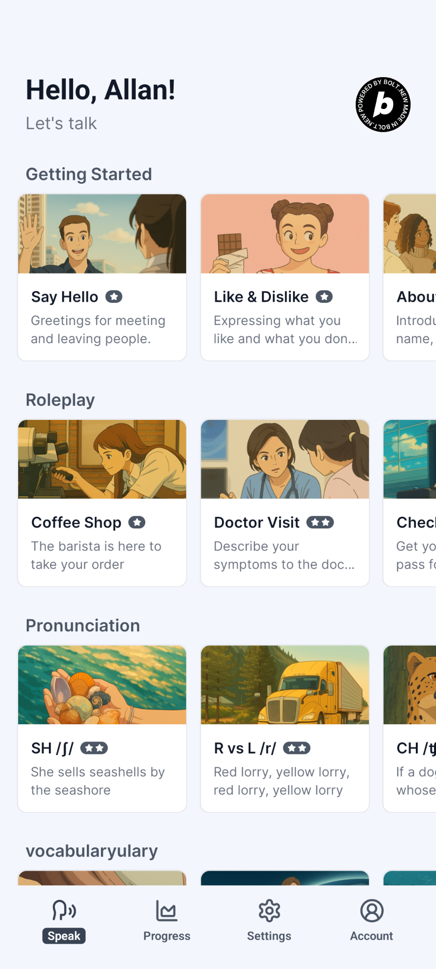 I built the application with bolt expo. I use chatgpt to generate illustrations. In the last days of the month I had to move on cursor to connect livekit.