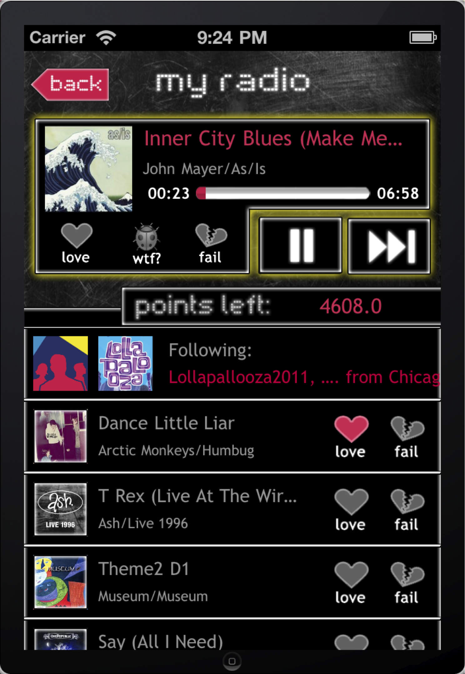 Lollapalooza is integrated into our emerging mobile platform for social, local music. We create highly personalized streaming playlists from people's musical preferences. We have integrated Lollapalooza 2011 as a "friend" in our system. Where one can normally interact with friends, Lollapalooza is also available. Simply tap on Lollapalooza and get a new playlist based on a random selection of the artists scheduled to play.