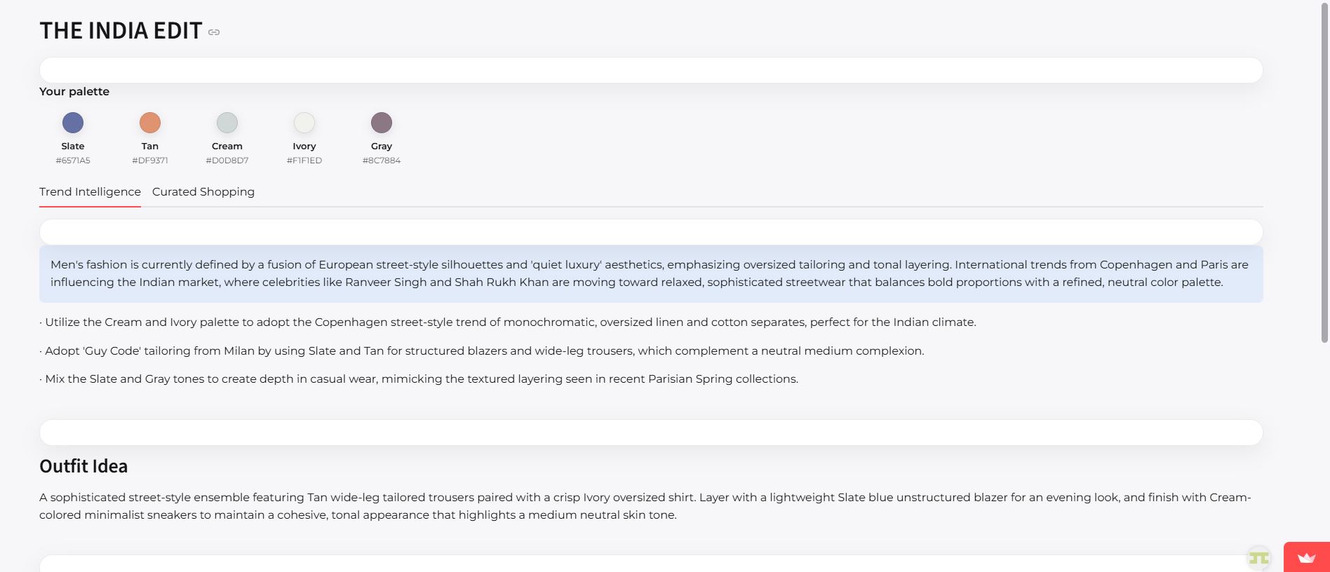 We also aim to introduce an intelligent styling agent that users can interact with directly - allowing them to ask whether certain colors or clothing pieces work well together, explore creative combinations, and build cohesive looks. This agent would act as a personal stylist, helping users not only follow trends but create their own.