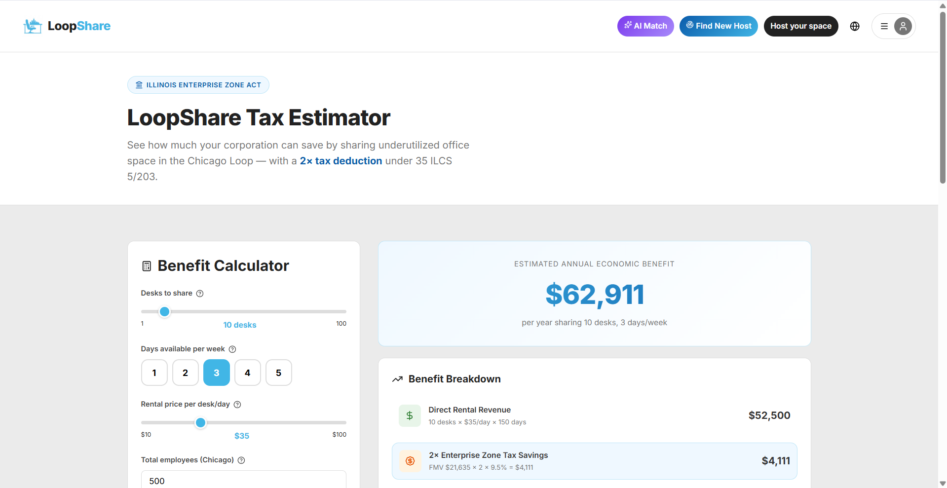 Tax Estimator: Calculate your annual savings from desk sharing using the Illinois Enterprise Zone Act.