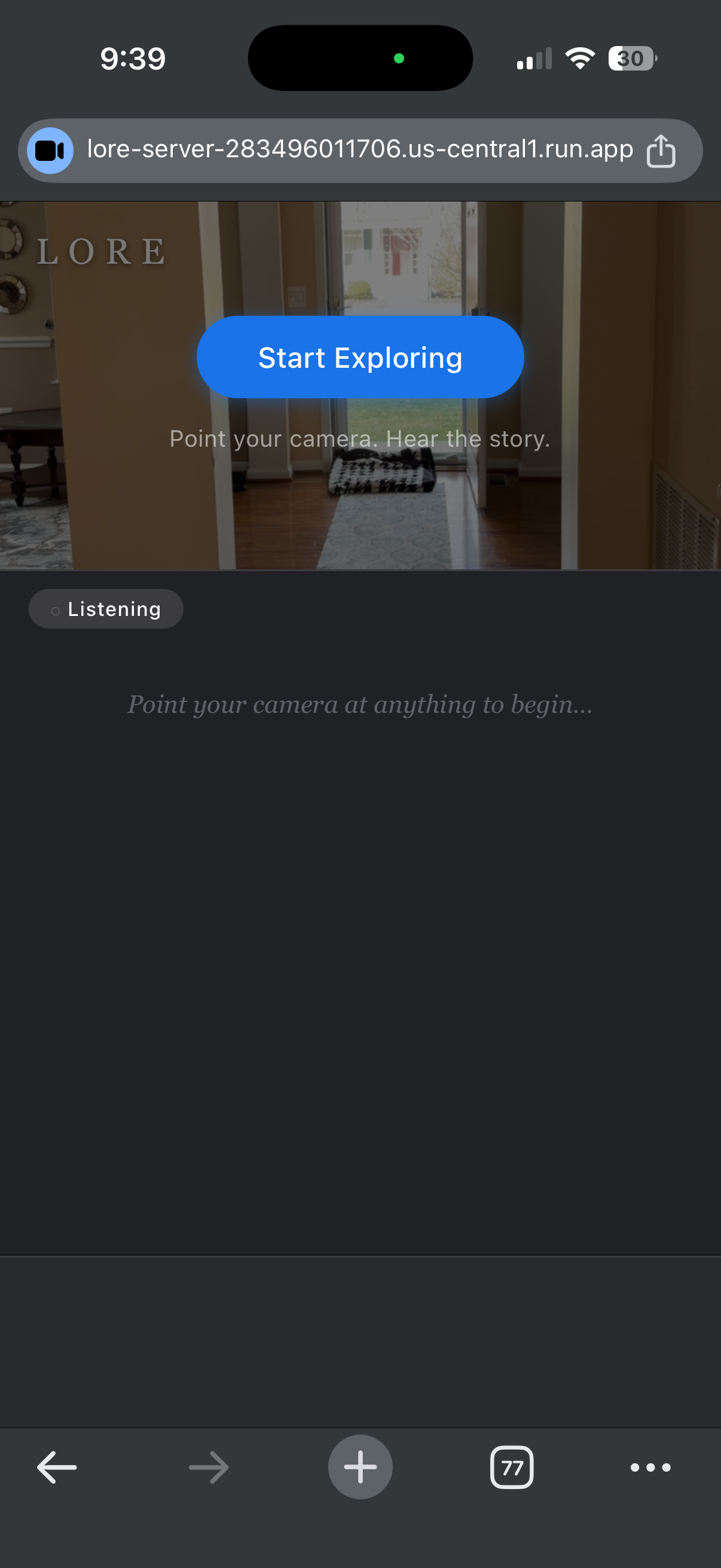 Lore listens to you, watches through your camera, and narrates what it sees — like a documentary, live, for whatever you're looking at. A monument. A dog. A book on your shelf. Ask a follow-up and it answers. Ask it to show you something and an image appears. Every fact it speaks is grounded in real search results, not guesses.
