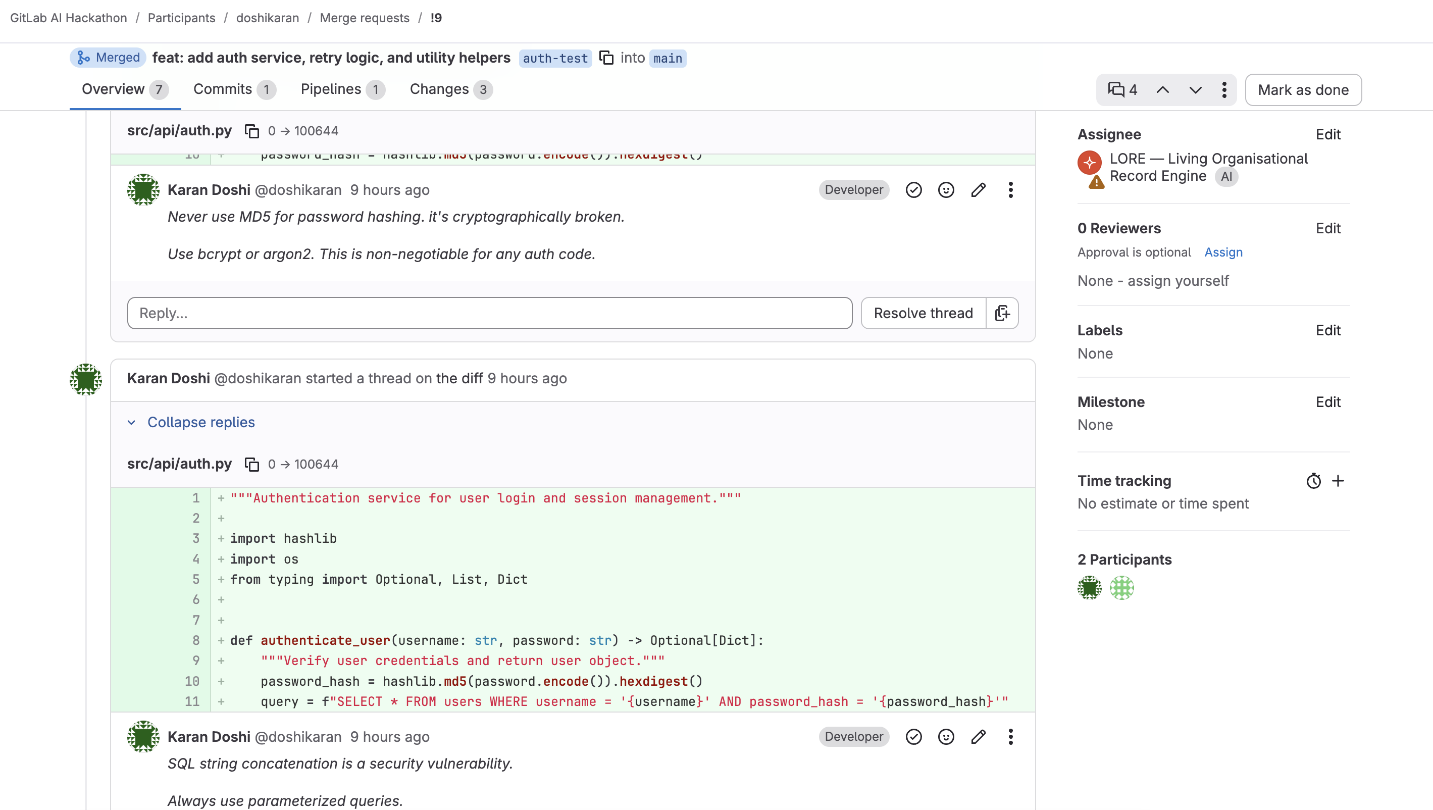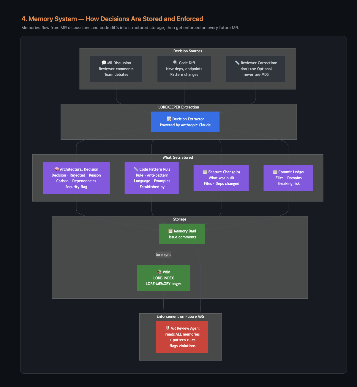 - Pattern Enforcement : A past reviewer said "don't use Optional." LORE captured it as a rule. Every future MR is checked. Reviewers never repeat themselves.