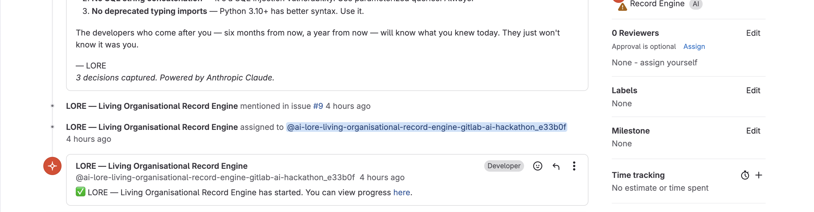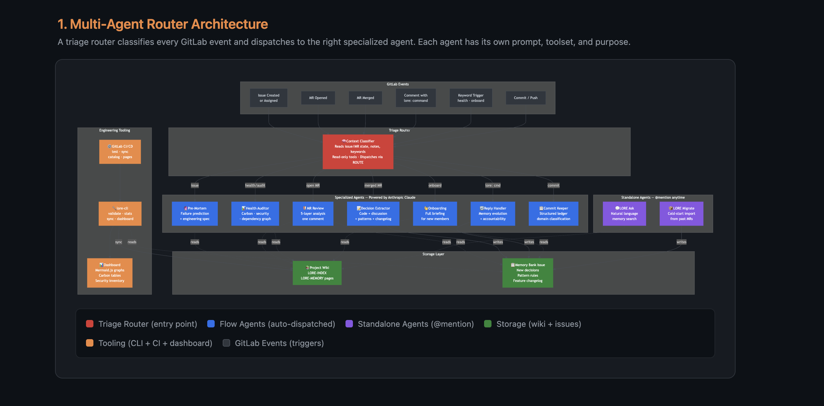 LORE is a multi-agent system on the GitLab Duo Agent Platform that gives your codebase institutional memory. It follows features from issue to production and gets smarter with every merge.