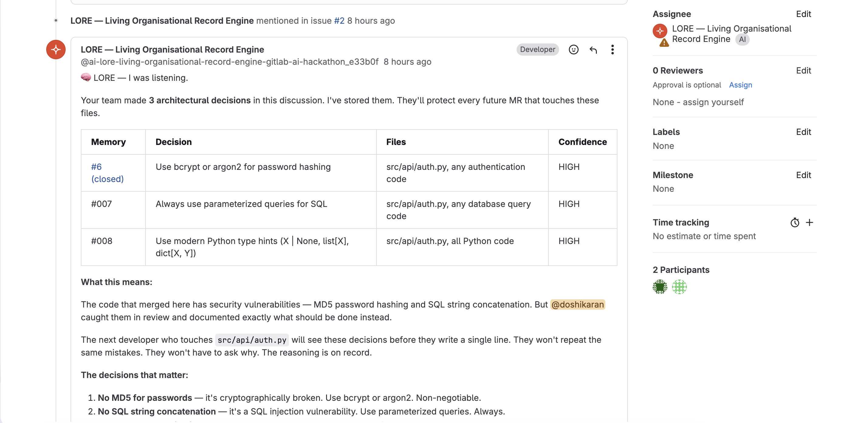 When a developer overrides a decision, LORE updates the memory, and then checks whether the code matches the new commitments. "You promised bcrypt, but line 37 is still MD5." Your commitments become institutional memory. Living, evolving, accountable.
