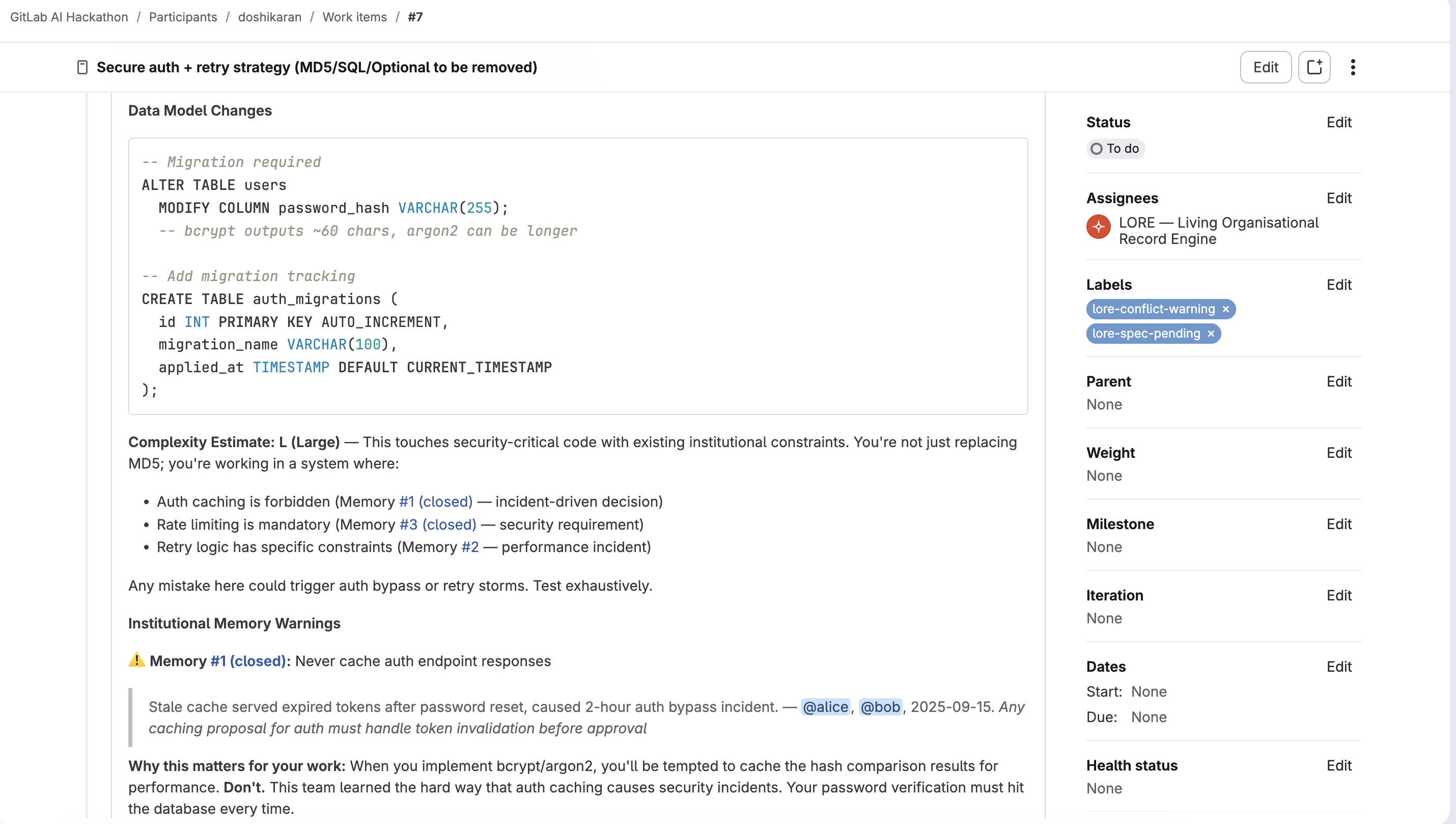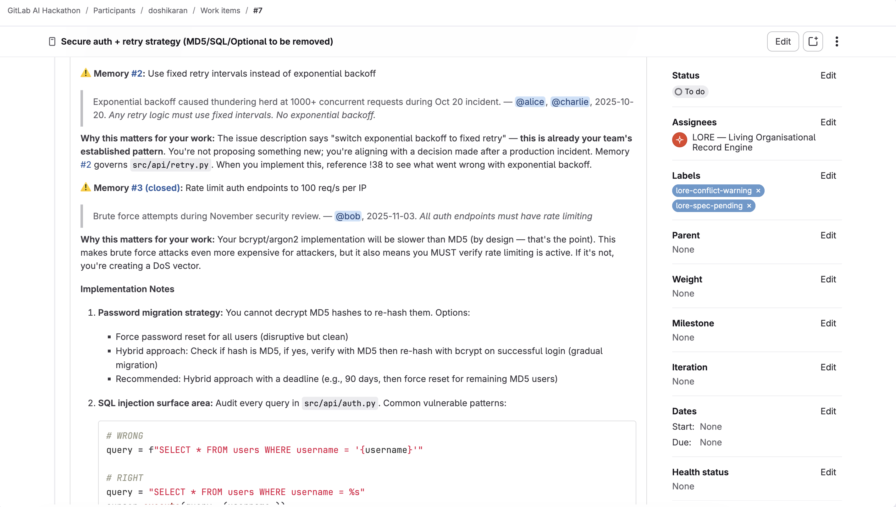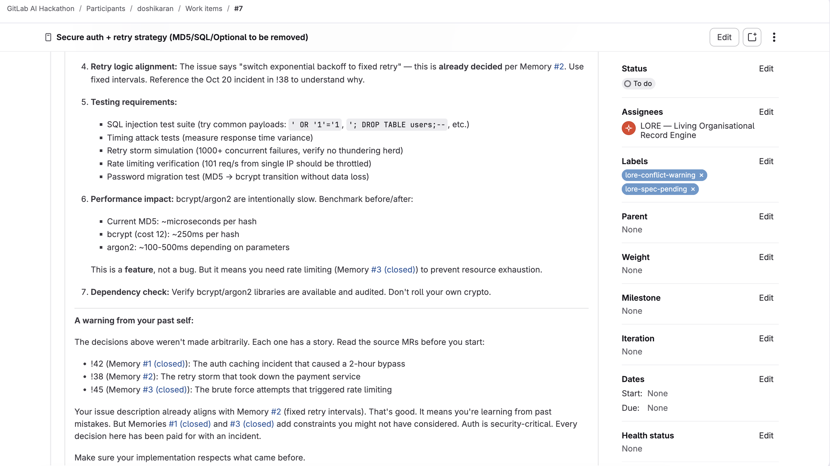 #Nto issues - LORE writes "Memory #1" but GitLab turns it into an issue link. Fixed by switching toLORE-MEMORY-001format. - Duo agents can't write to wiki - LORE reads from wiki, writes to issues. Built