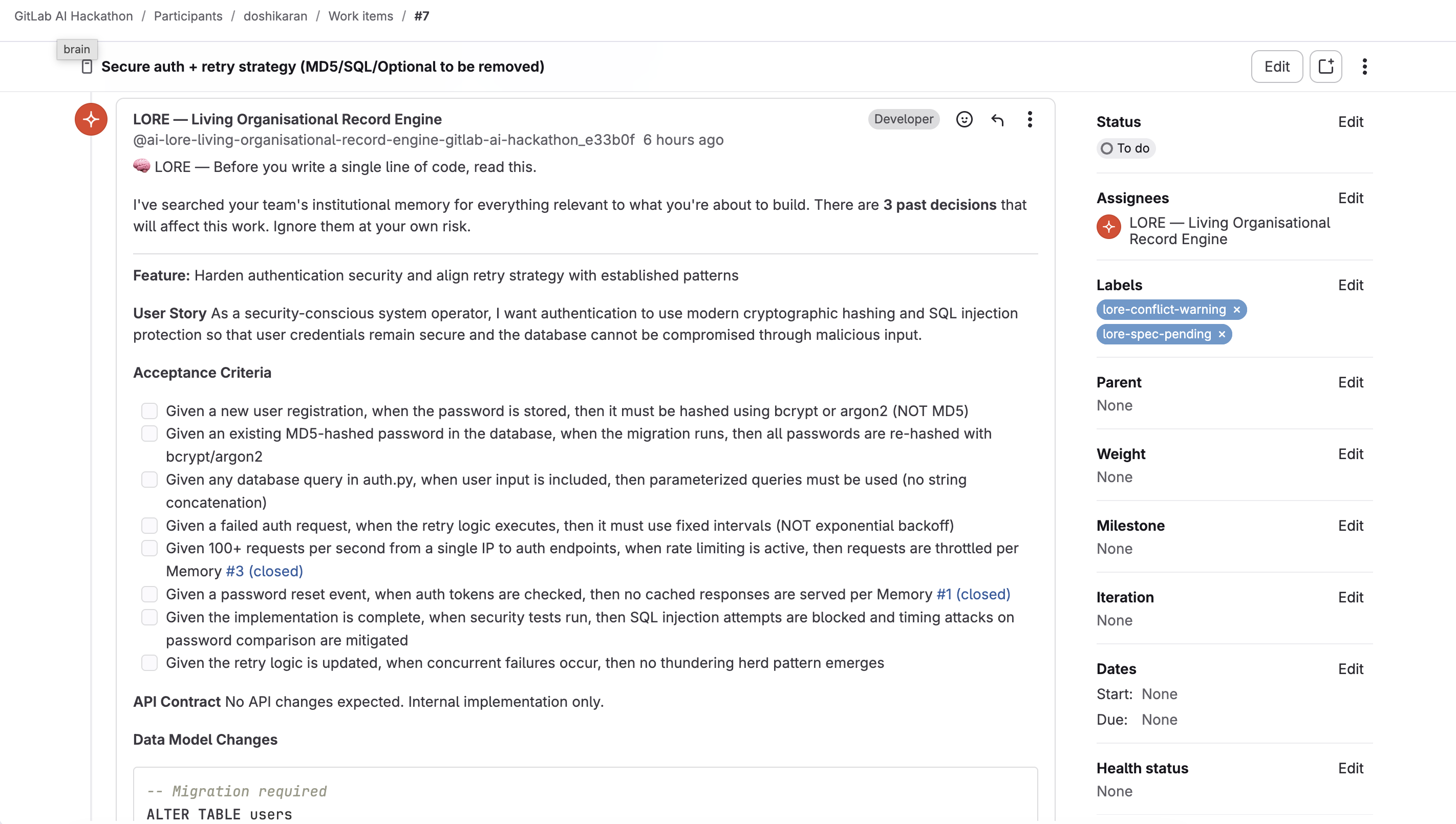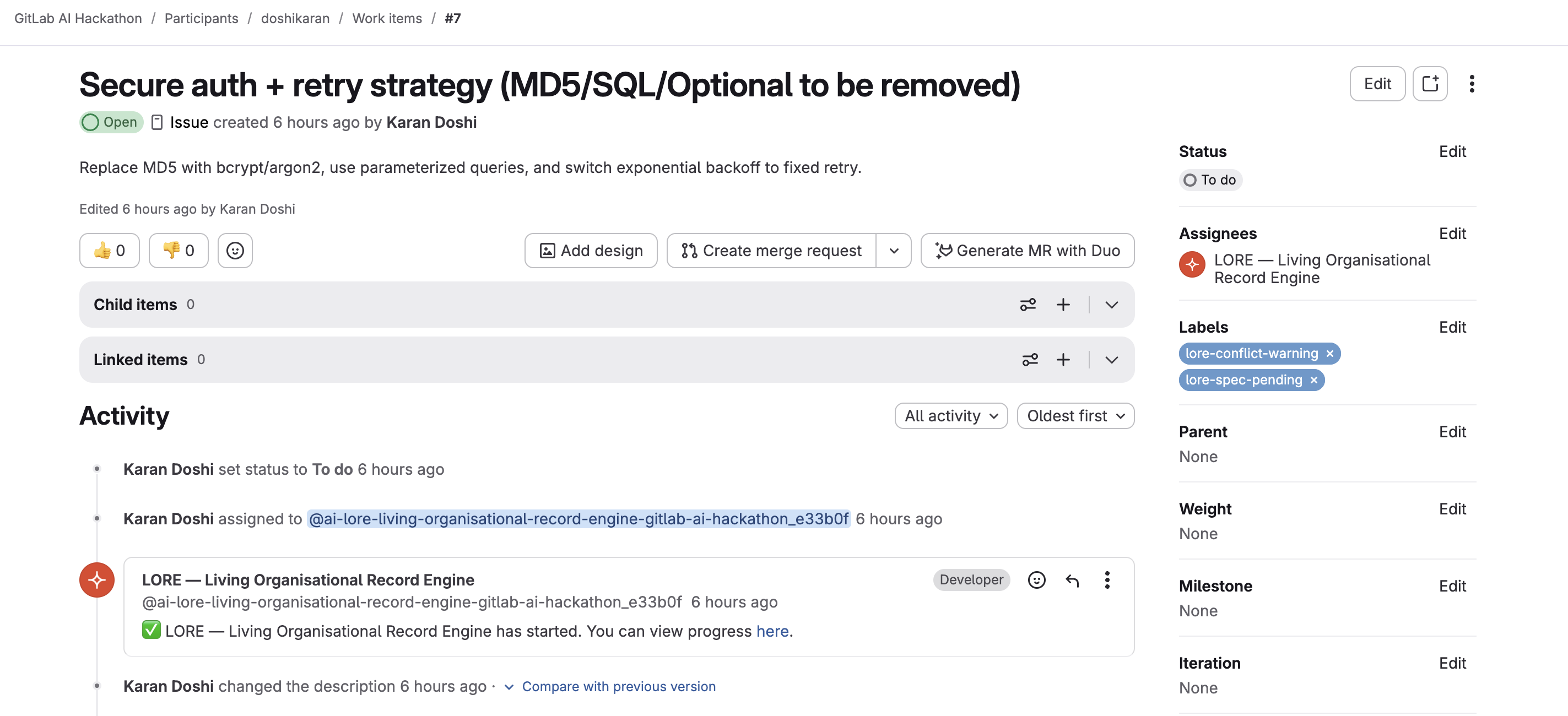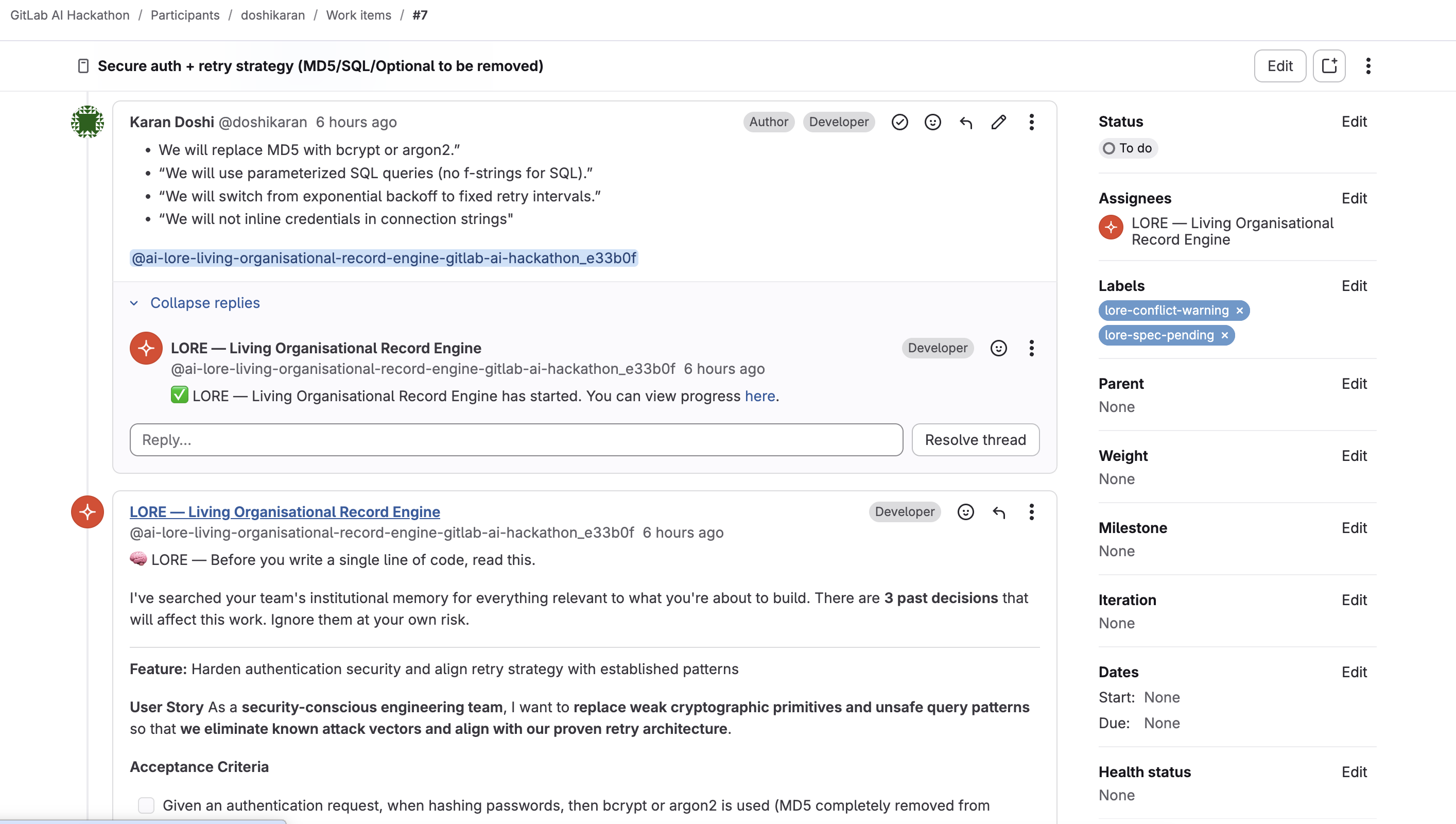 #Nto issues - LORE writes "Memory #1" but GitLab turns it into an issue link. Fixed by switching toLORE-MEMORY-001format. - Duo agents can't write to wiki - LORE reads from wiki, writes to issues. Built