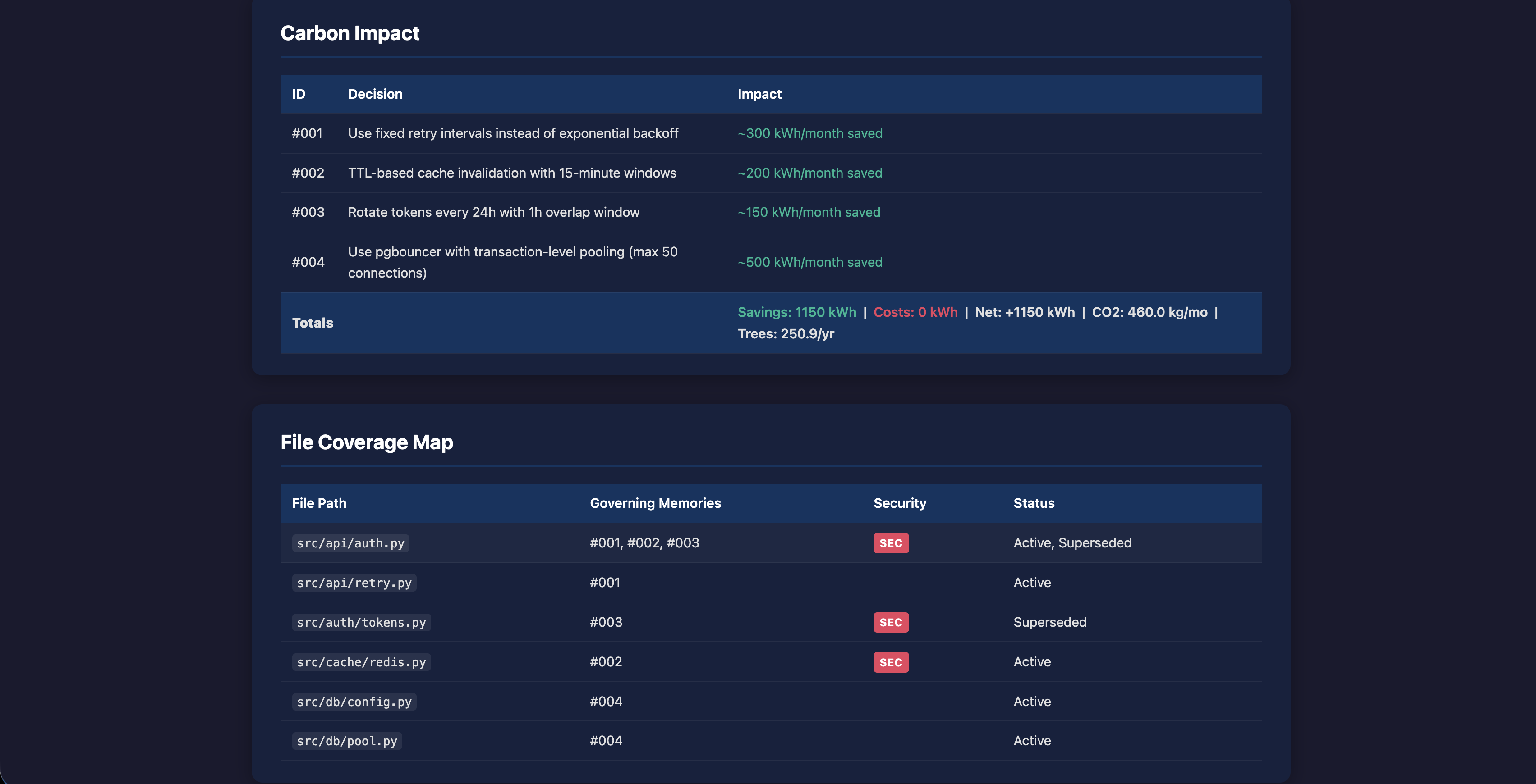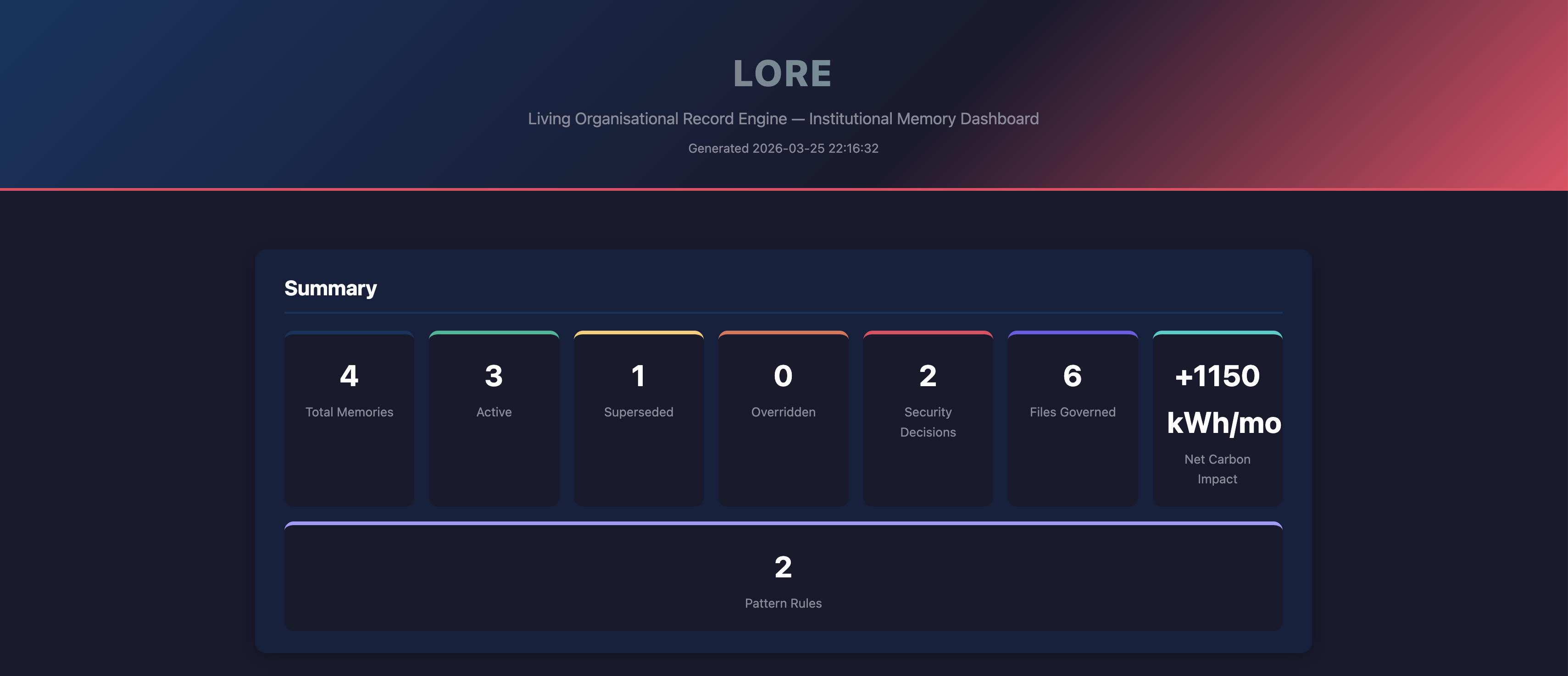 lore dashboard generates a self-contained HTML page with Mermaid.js decision graphs, carbon impact tables, security inventory, and file coverage maps.