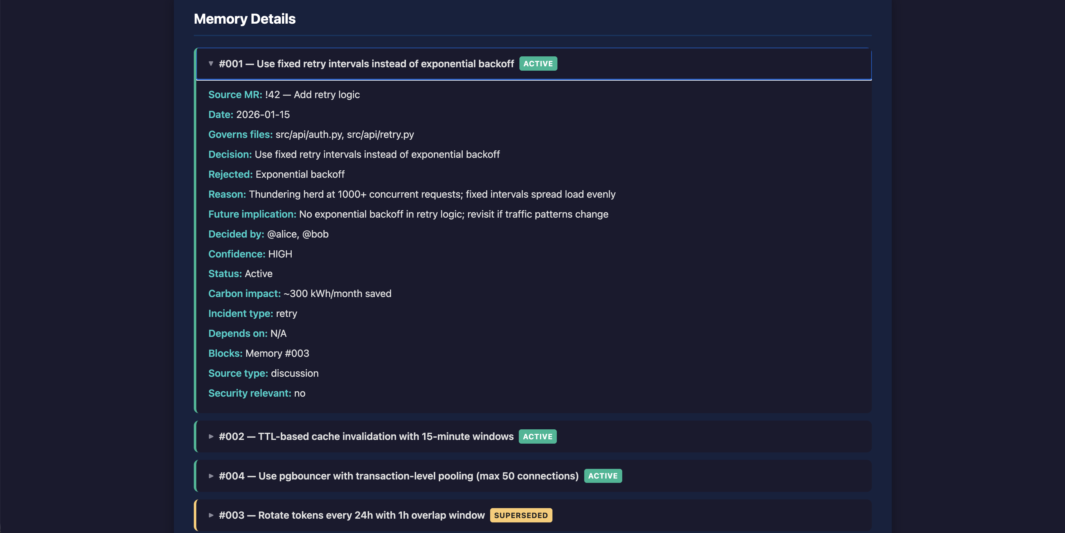 We've been on these teams. We've watched the same decisions get made, forgotten, and repeated. Not because anyone was careless - because decisions live in MR threads nobody will ever reopen, in the heads of engineers who've already left.