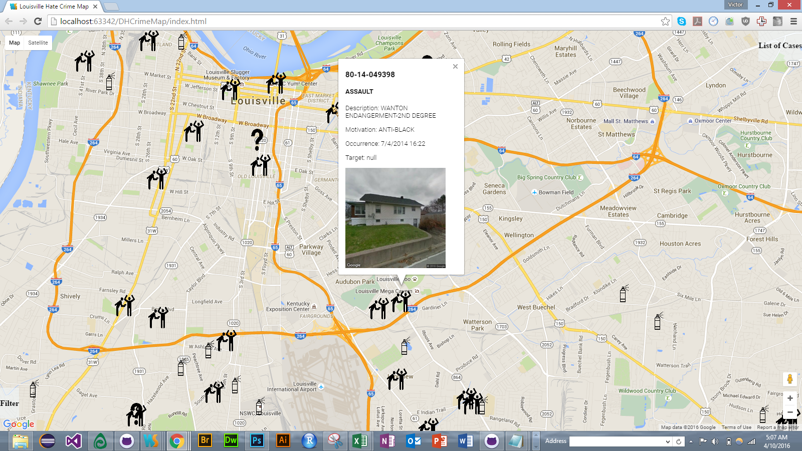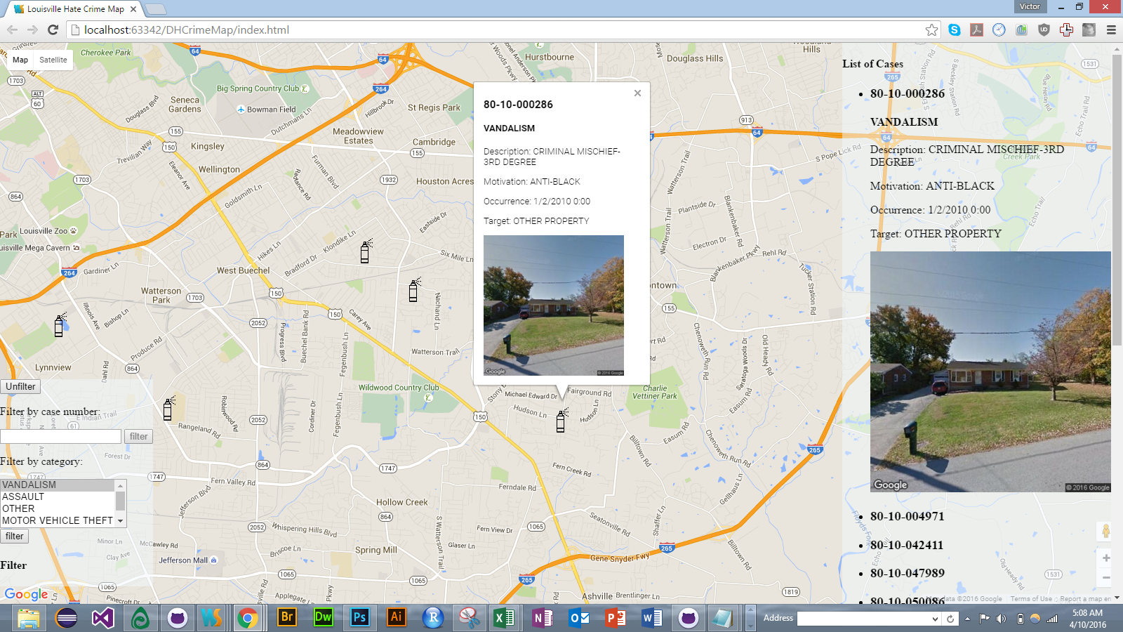 It visualizes the data on hate crime reports within the last few years on an interactive map. The functionality includes a case number search, category filtering and an interactive list of cases besides the functionality provided by the map.