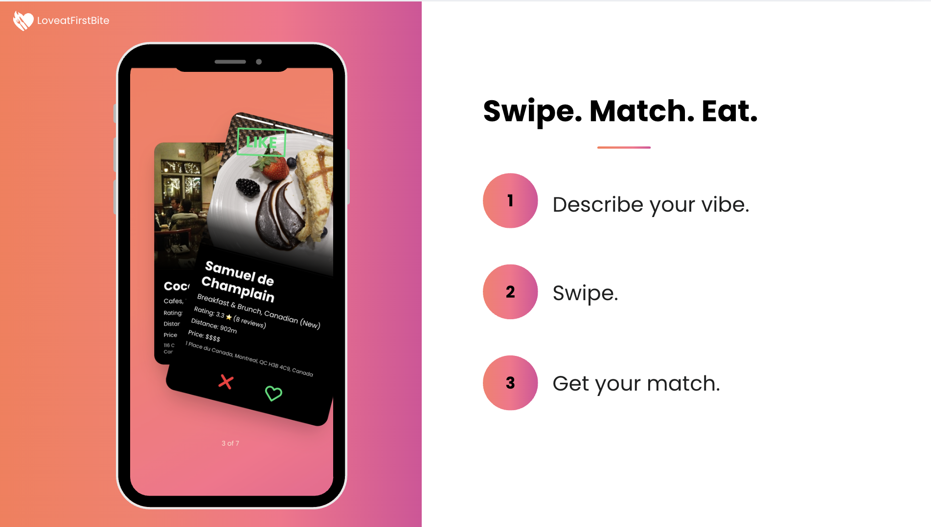 We built Love At First Bite to make finding dinner faster and more fun than the traditional restaurant browsing experience.
