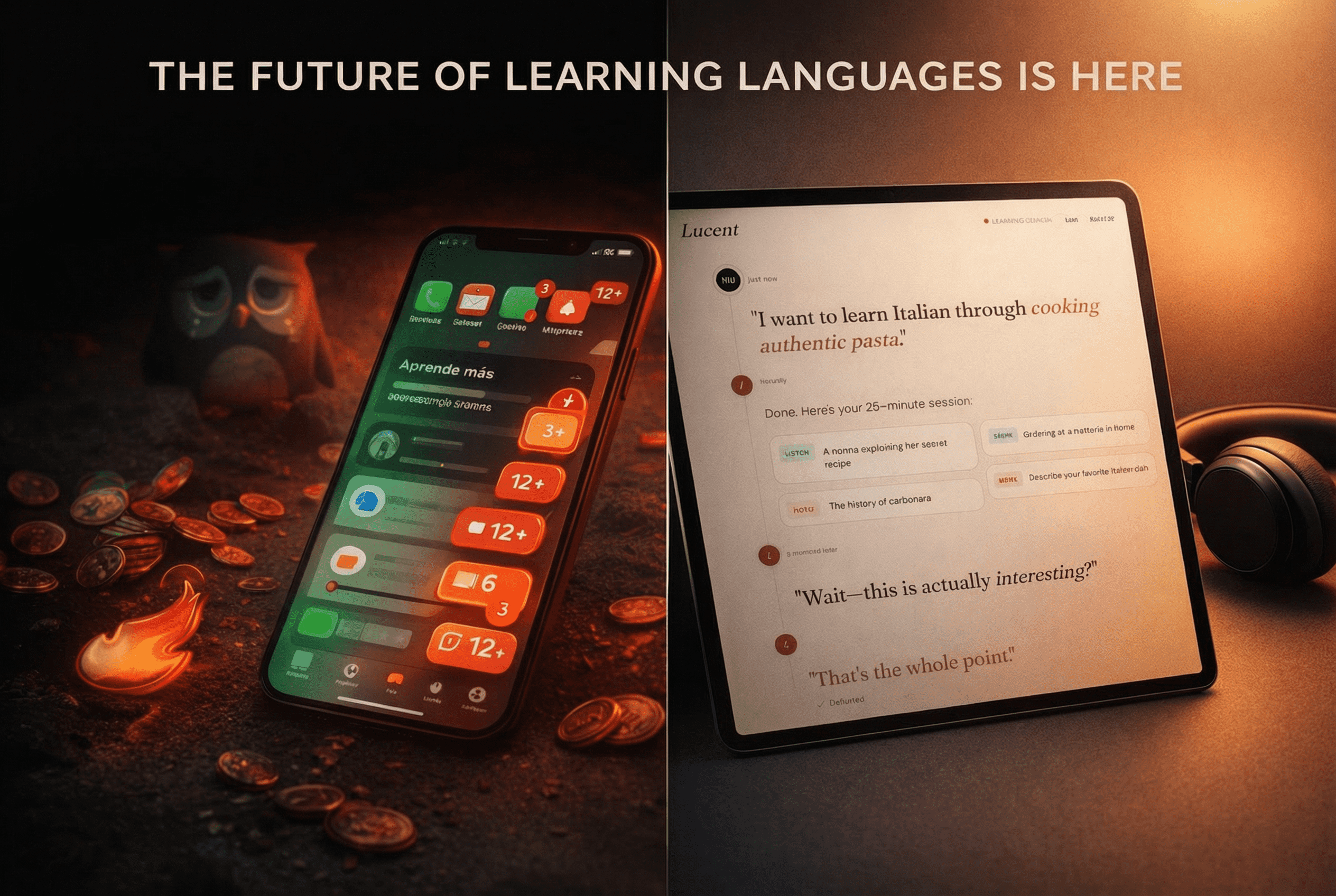 Lucent is a daily language immersion platform where you create your own content. No predefined lessons. No curricula. No "everyone starts with colors and numbers."