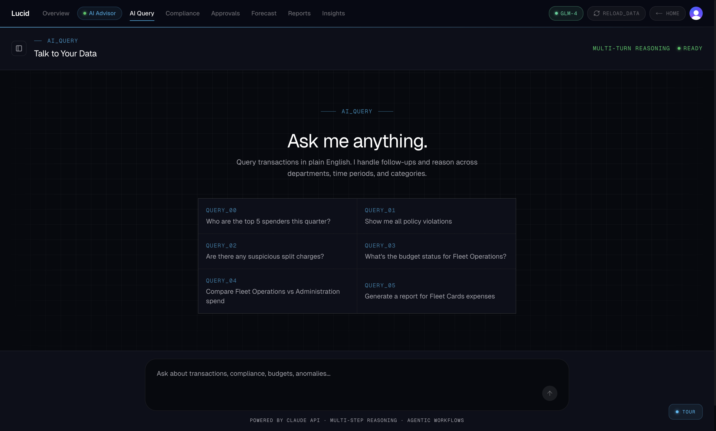 - Talk to Your Data — Finance managers ask questions in plain English ("What did Fleet Operations spend on fuel vs permits last quarter?") and get back charts, tables, and summaries with full multi-turn context
