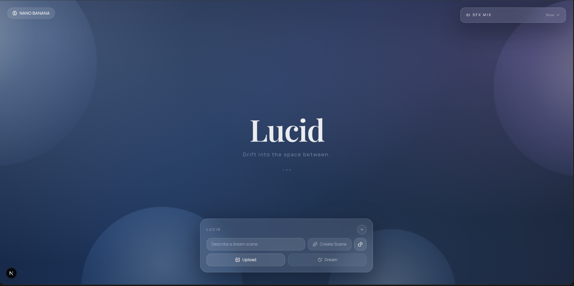 - See: You upload an image or type a scene description to generate a liminal dreamscape using Gemini's native image generation (Nano Banana / Nano Banana Pro). Hit the dice for a random scene.