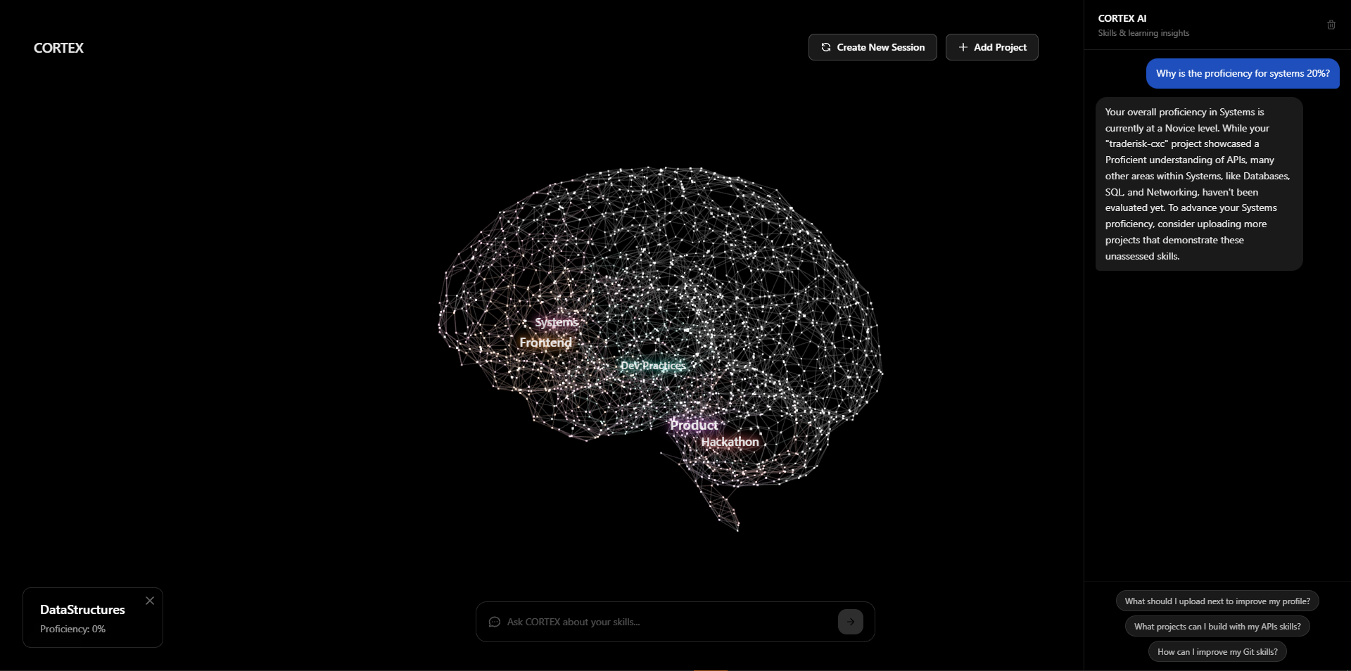 Upload GitHub repos, PDFs, or text β Cortex scores your skills across 51 categories using Google Gemini, maps them onto a glowing interactive brain, and offers AI-powered learning advice through a built-in chatbot.