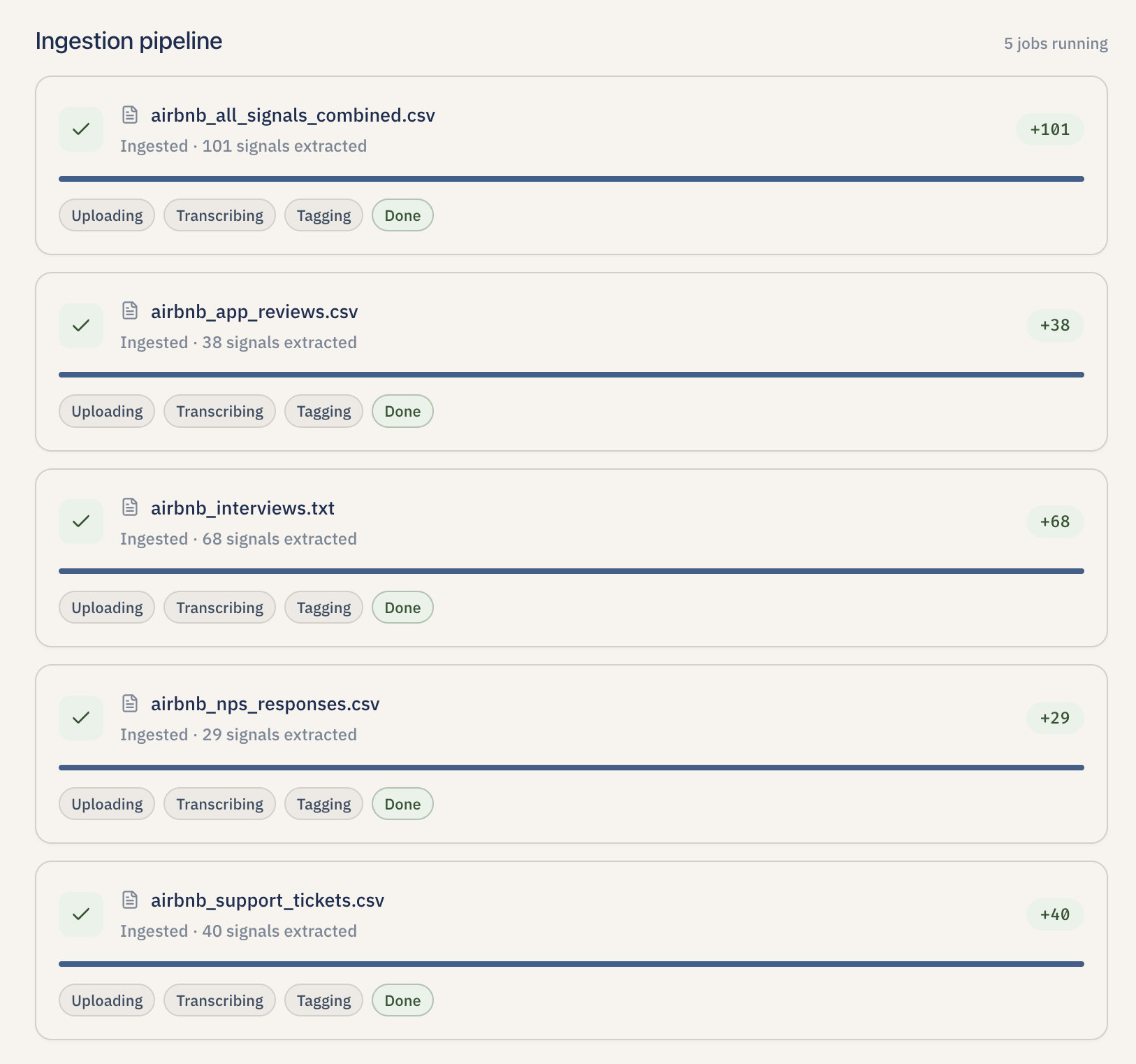 Parallel file uploads turn raw CSVs and transcripts into counted, tagged signals before synthesis.