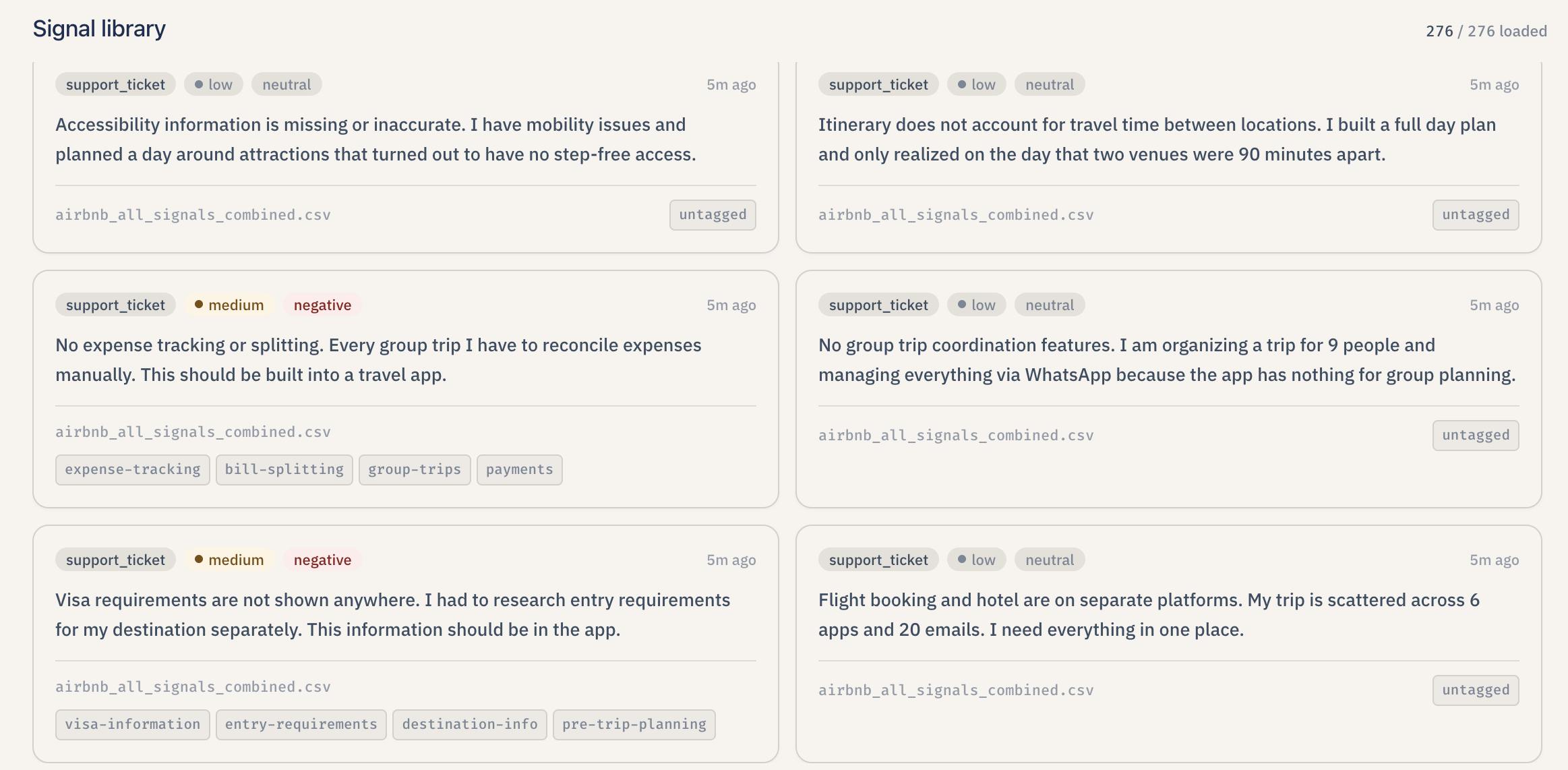 - Chunking the right way and writing prompts that actually use the context. Getting clean context out of the uploaded files was much harder than it looked. A long interview transcript split naively in the middle of a thought would strip the user's pain of its surrounding setup, and the AI would either over-summarize it or miss it entirely. Comma-Separated Values exports from support tools were even worse — the useful column was rarely the first one, and concatenating every column dragged in metadata the model treated as user voice. We iterated heavily on speaker-turn splitting for transcripts, paragraph-level splitting for documents, and a small allow-list plus fallback for choosing the best column in a Comma-Separated Values file. On top of that, the prompts themselves had to be tightened over and over: early versions of the tagging prompt produced generic tags like "feedback" and "issue" that destroyed downstream clustering, the early naming prompt returned bland labels like "Search issues," and the early Product Requirements Document prompt happily invented user pain that no signal supported. The fix was a mix of stricter examples in each prompt, severity and citation rules that name the failure modes out loud, and a post-validation step that rewrites or drops anything that does not trace back to a real signal identifier.