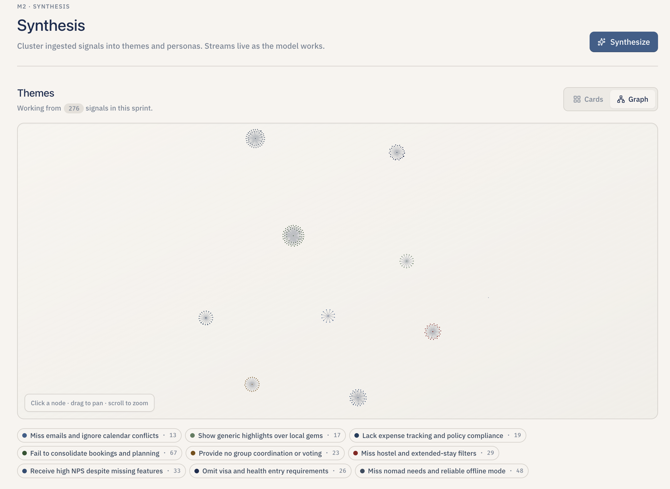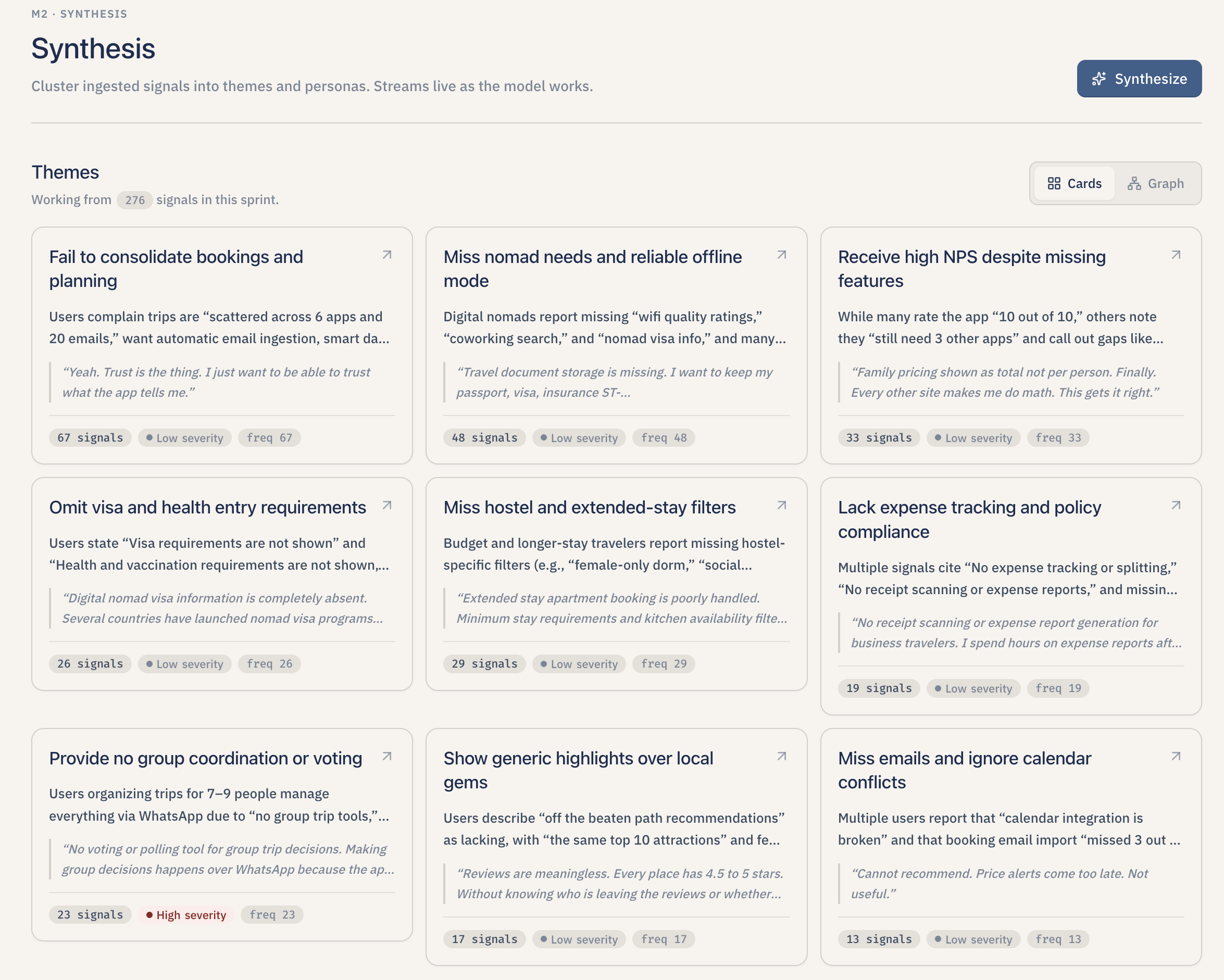- Themes that feel earned, not invented. Using real embeddings, real clustering, and centroid-based retrieval (instead of asking a model to "find themes" in one shot) made theme names specific enough that PMs reading them could immediately tell which signals fed which theme.