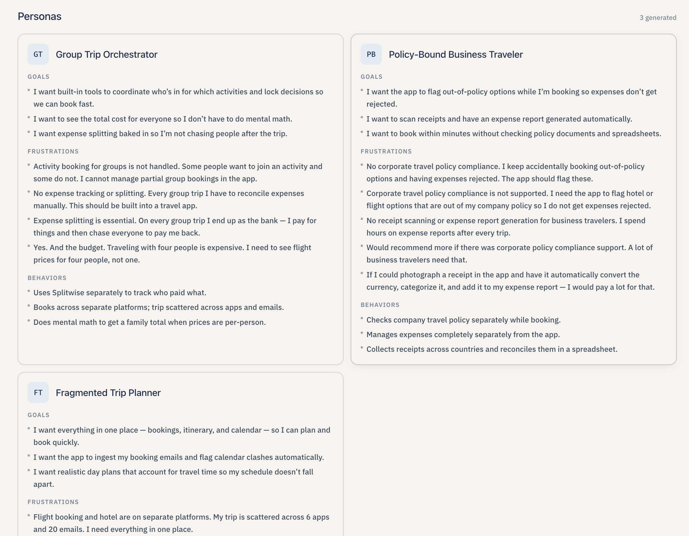 AI-generated user archetypes, name, goals, frustrations and behaviors, streamed on Synthesis after themes, grounded in the sprint’s signals.