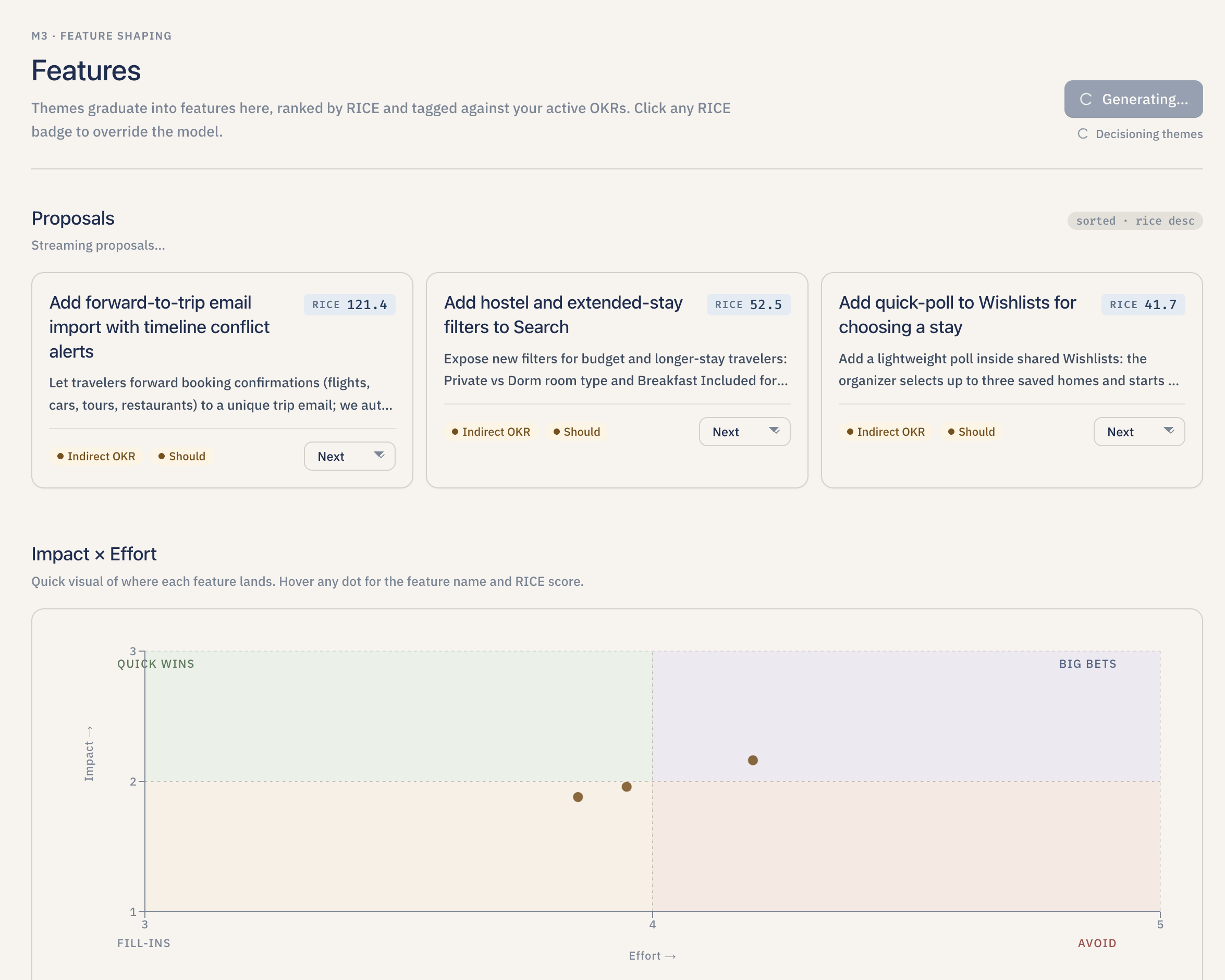 - Decide what to build. For each theme, Lumen drafts one feature proposal with a RICE score (Reach, Impact, Confidence, and Effort), a MoSCoW priority (Must have / Should have / Could have / Won't have), an OKR alignment ("direct," "indirect," or "none"), and a roadmap slot ("Now," "Next," or "Later"). The PM can override any of those numbers and the score recalculates instantly.