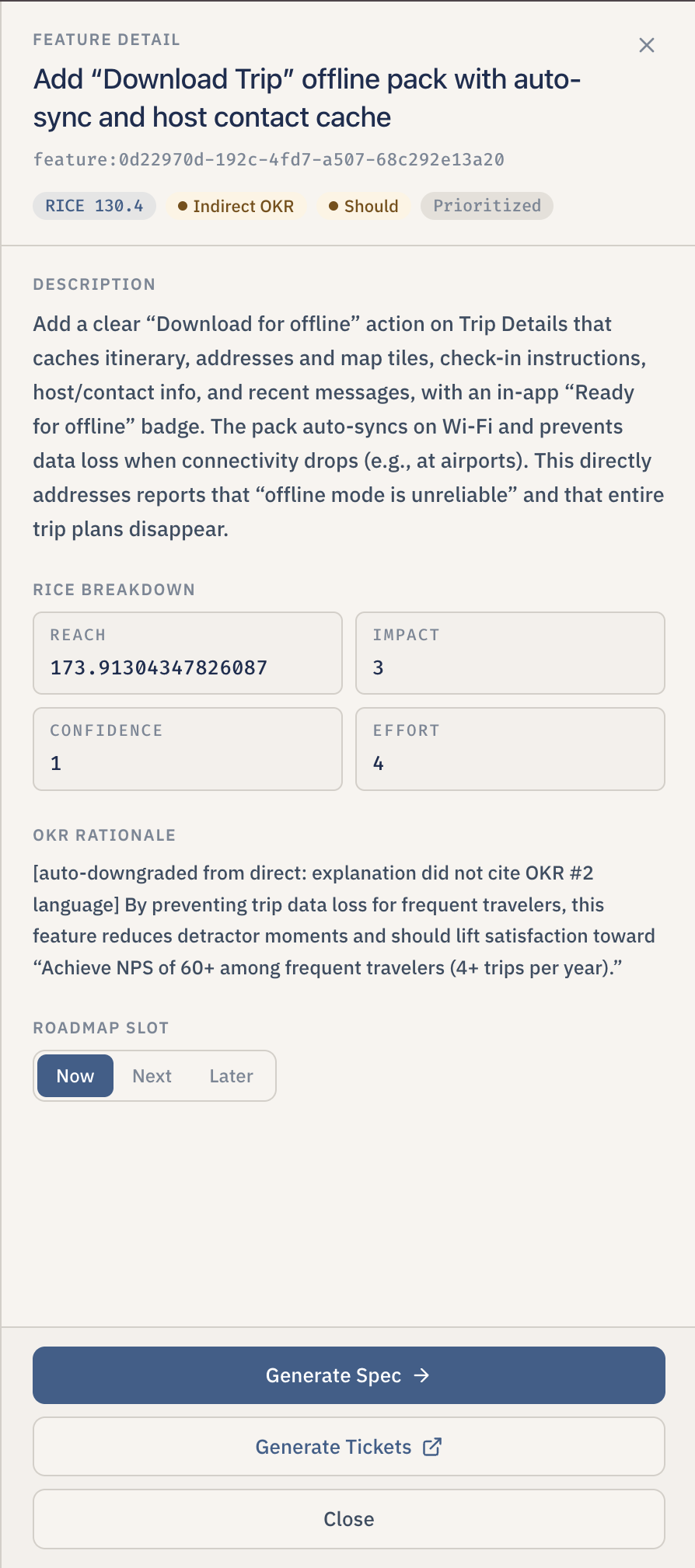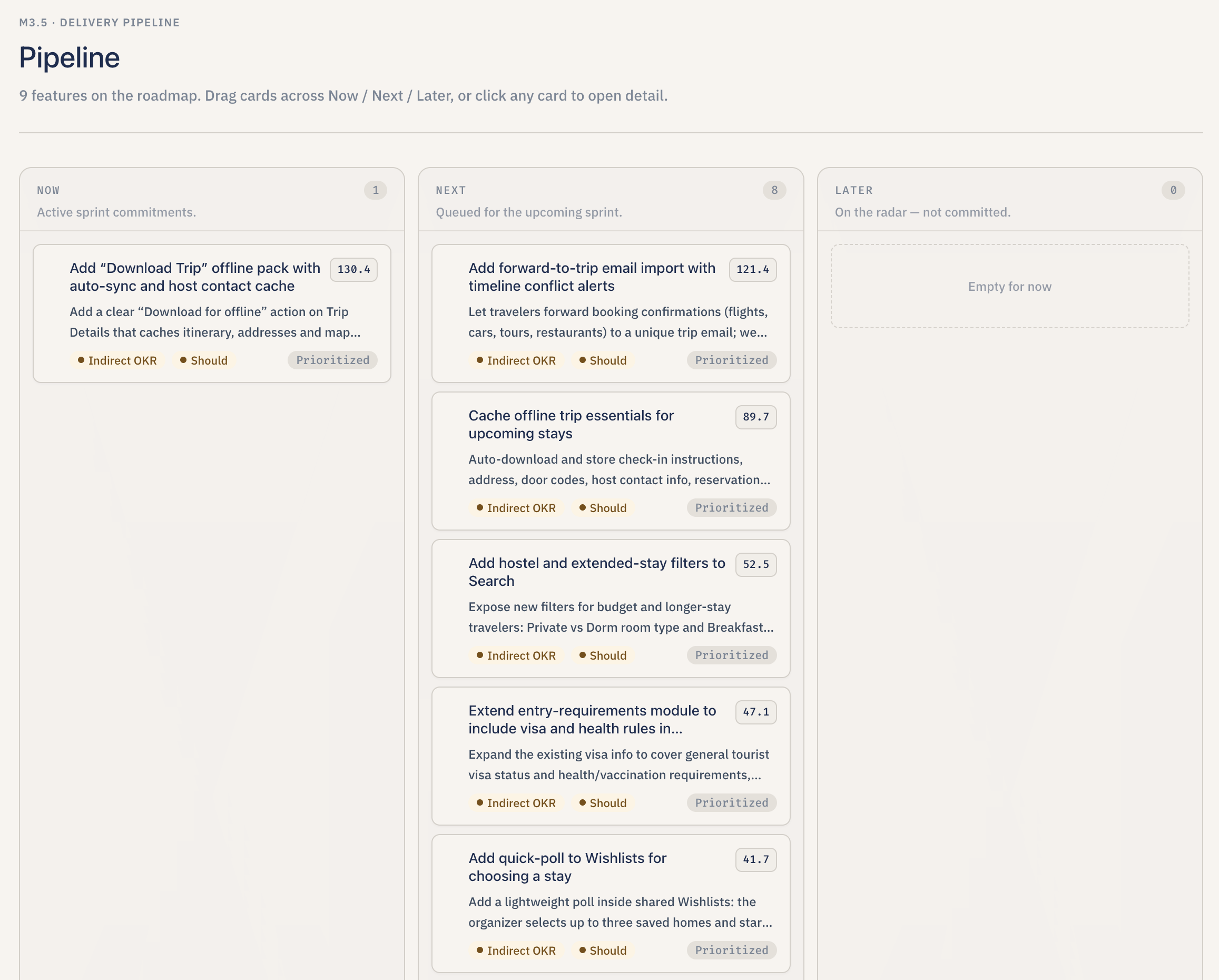 - Run the pipeline like a board. All proposed features land on a drag-and-drop board with three columns — Now, Next, Later — so the user can reprioritize by dragging cards. Each card shows the RICE score, the OKR alignment tag, and the MoSCoW badge. Clicking a card opens a side drawer with the full breakdown and rationale.