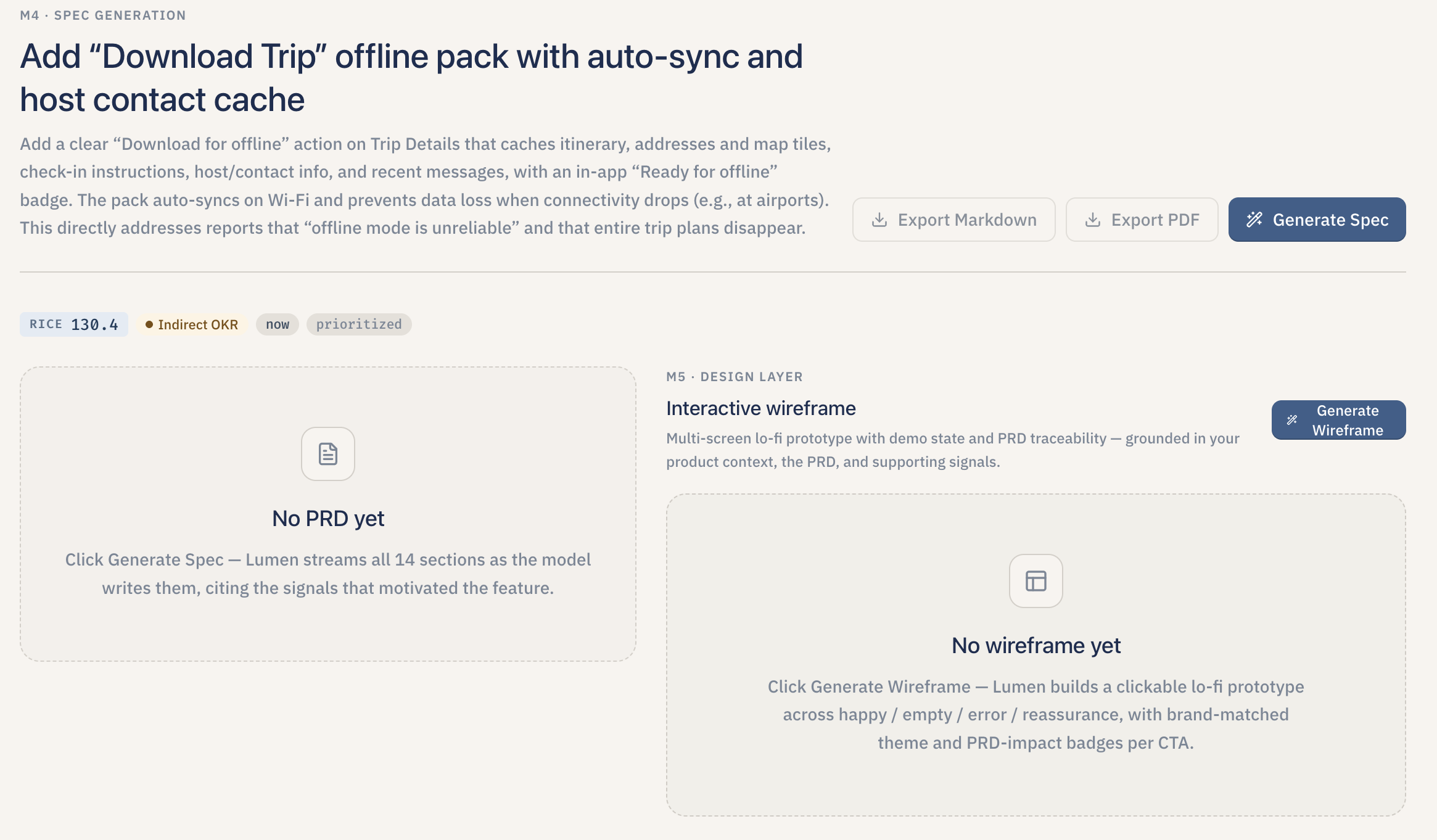 - The handoff is the product. A tool that produces a beautiful PRD but no machine-readable ticket export is a tool that engineers will quietly stop using. Getting Markdown / MCP JSON / Linear / Jira out the door turned Lumen from a demo into something a team could actually ship through.