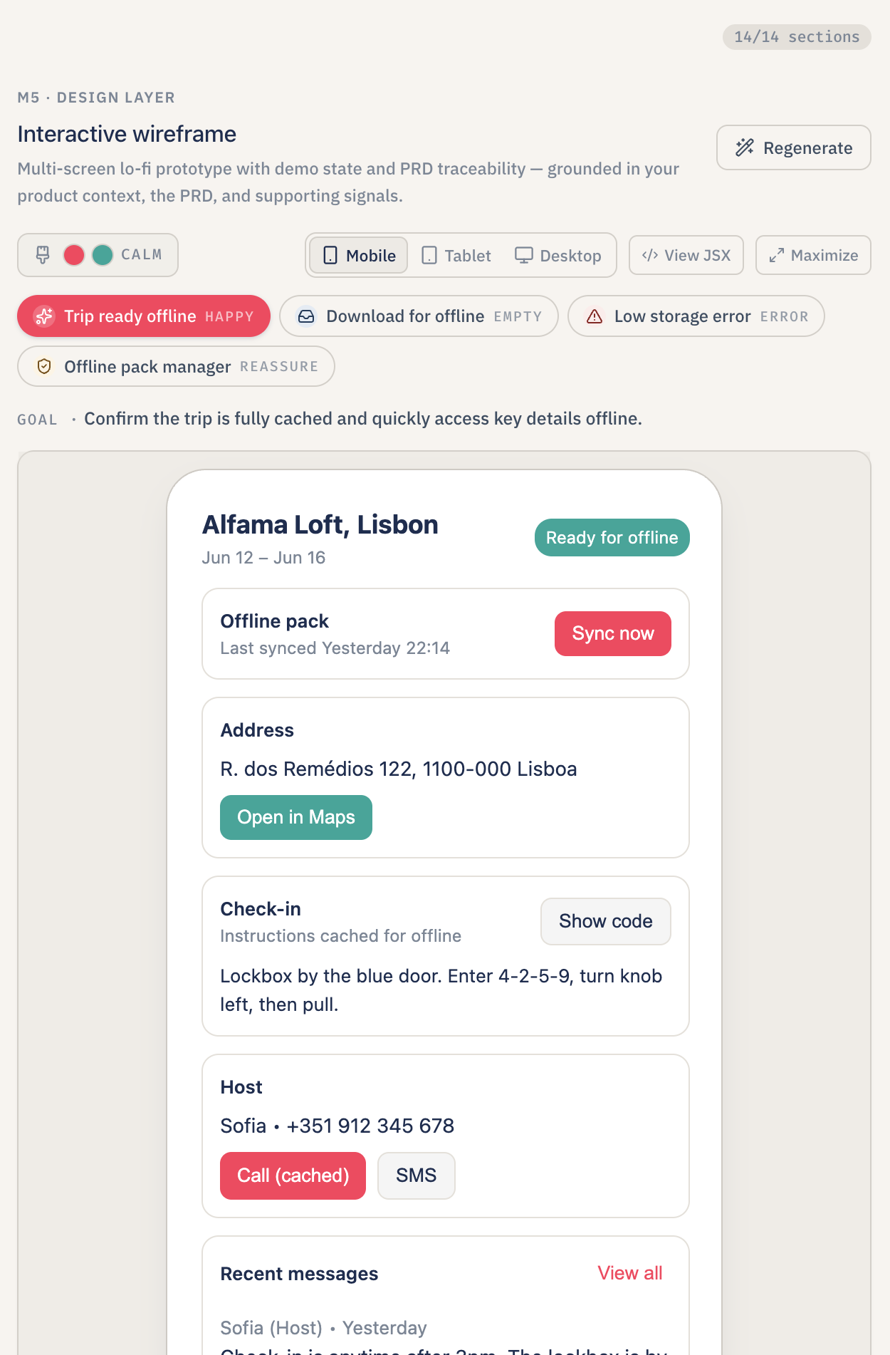 - Clickable lo-fi wireframes. Not static images — a sandboxed React preview where the buttons actually navigate, a state object actually patches, and every interactive element is wired back to a Product Requirements Document metric or user story so the PM can see, in one place, what each click is supposed to move.