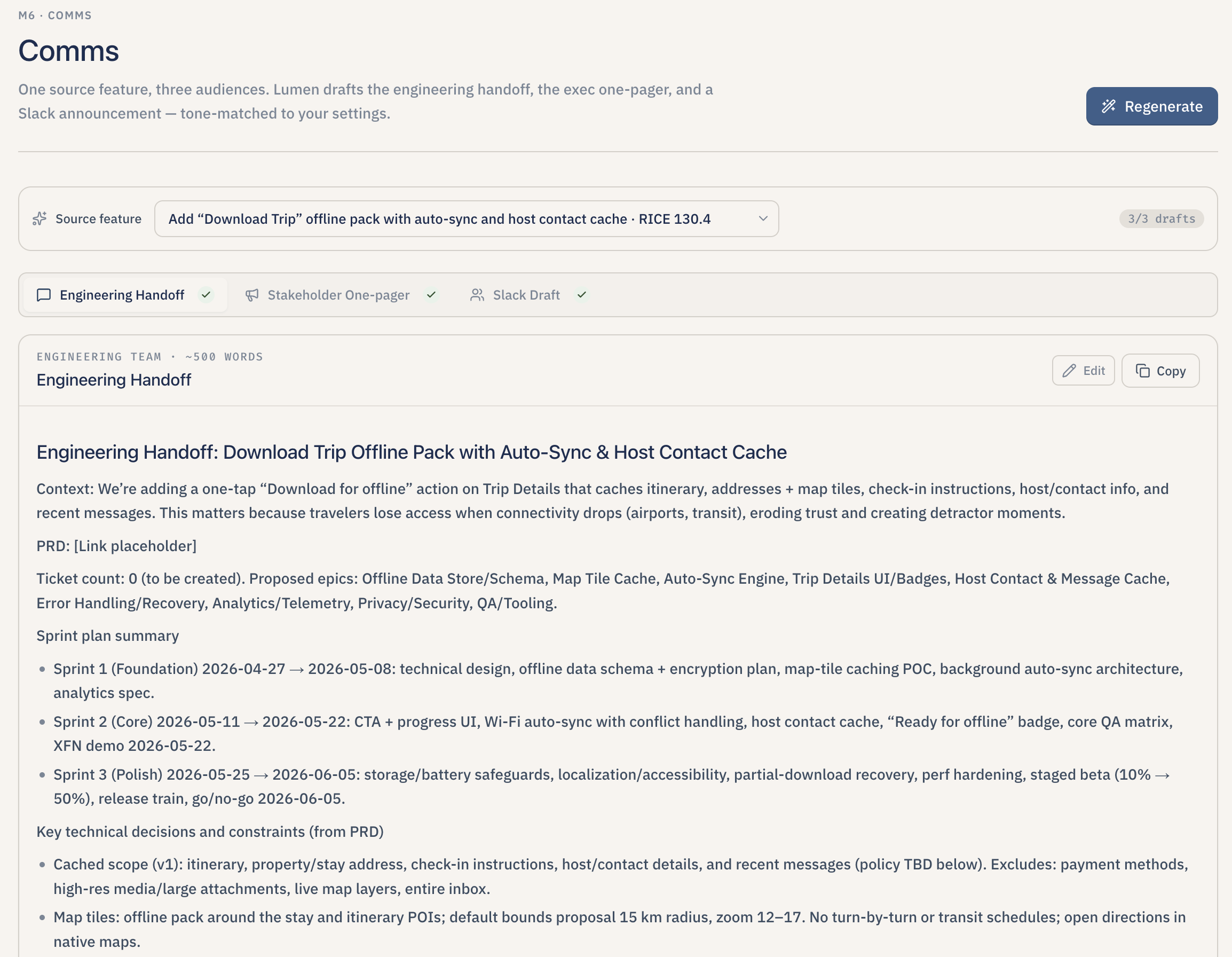 - Draft the communications. With one click, Lumen drafts an engineering handoff document, a one-pager for executives, and a Slack-ready announcement — each tuned to the team's saved tone preferences (for example, "direct, technical, no fluff" for engineers; "confident, concise, outcome-focused" for executives).