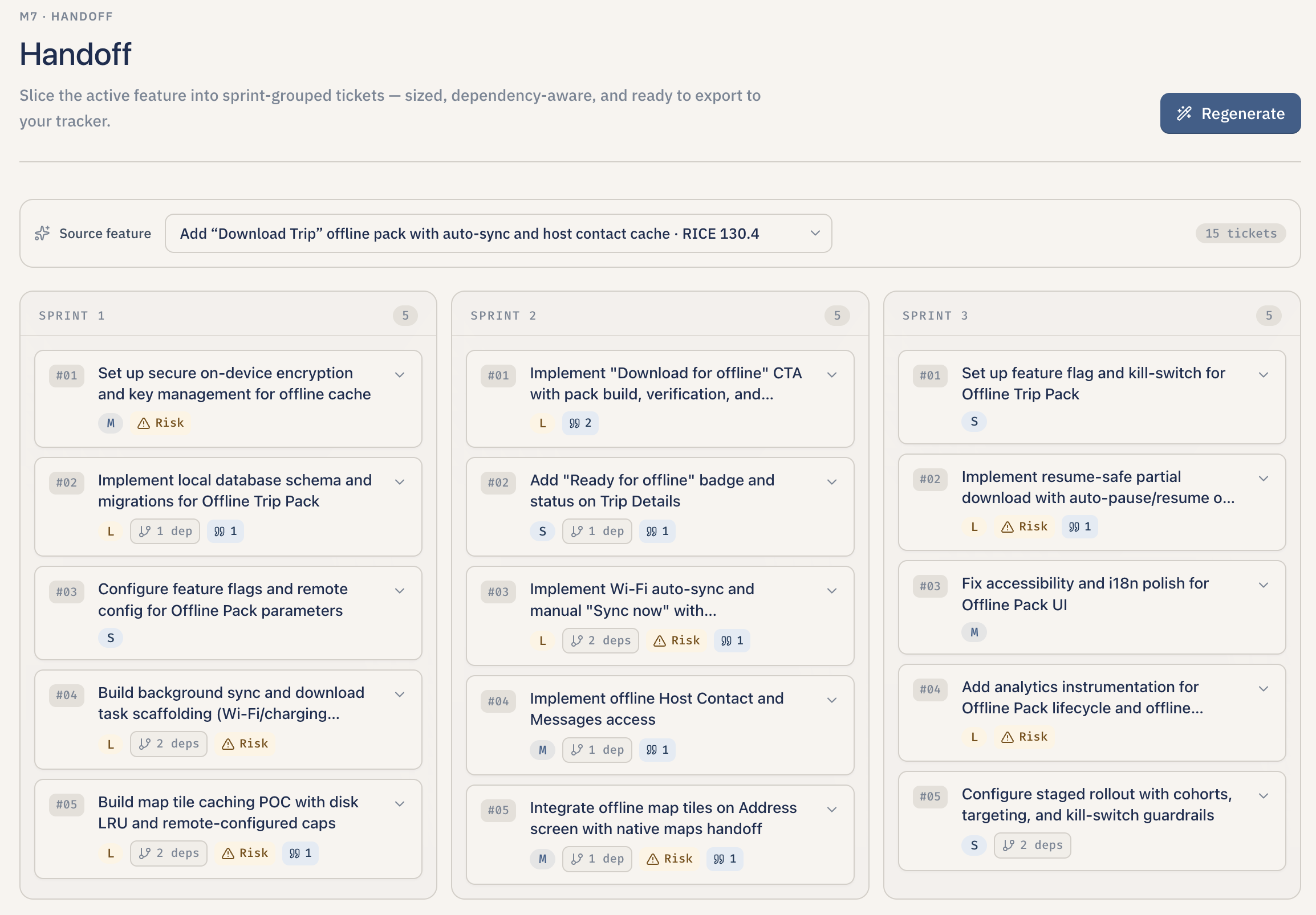 Sized tickets with acceptance criteria and export to Markdown, MCP JSON, Linear, or Jira.