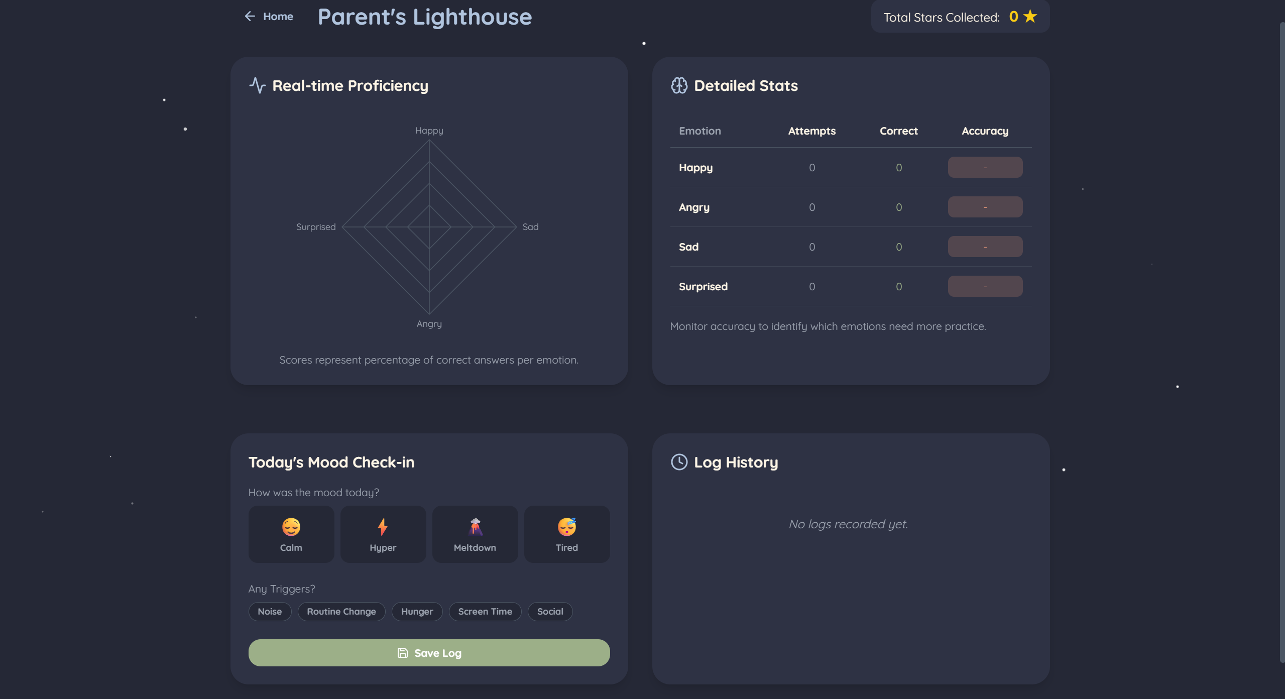 - The "Lighthouse" Dashboard: I am particularly proud of the Parent Dashboard. Transforming raw game inputs into a clean Radar Chart and a detailed Training Log makes the app genuinely useful for tracking behavioral trends over time.