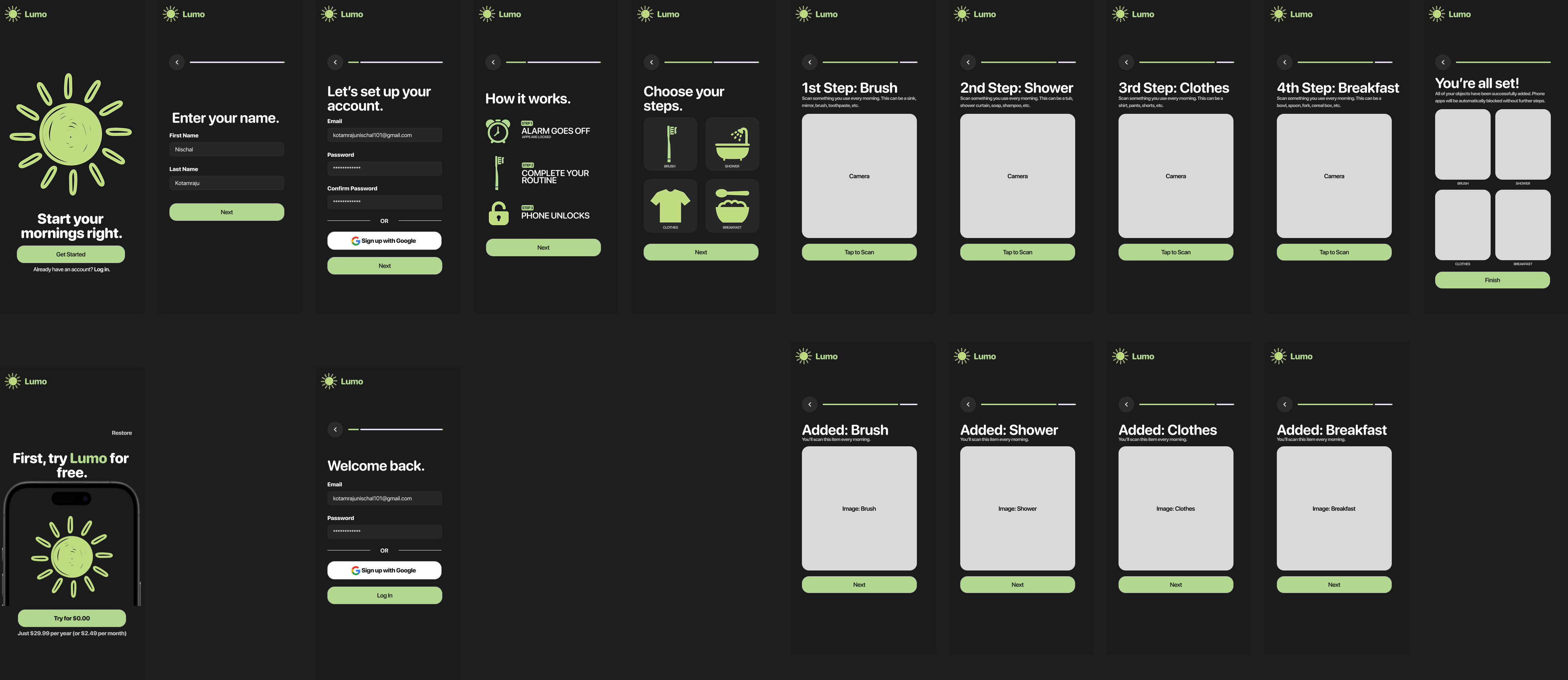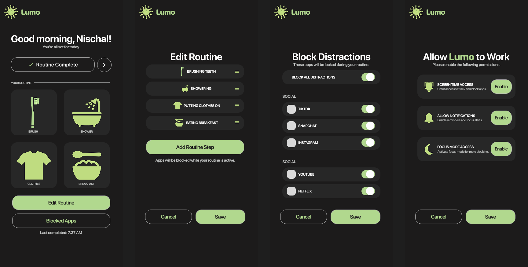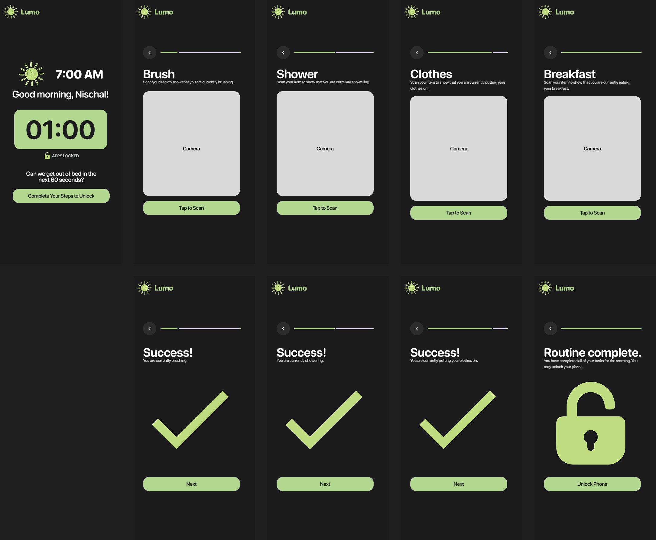 Lumo is a way for students and employees to make their morning more productive by forcing users to wake up on time without snoozing alarms and restricting phone use until after their morning routine is finished. Every morning, an alarm will go off on the user's phone. The user will have 60 seconds to get out of their bed and start their morning routine. If the user does not get out of bed within 60 seconds, the phone will stay locked and the user will not be able to use any phone apps until after the morning routine has been finished. To verify that the user did legitimately make their morning productive, there will be a series of checkpoints that the user will complete. Every checkpoint (brushing, showering, picking clothes, and eating breakfast) will require an object to be scanned by the phone to mark the completion of each step of the routine. For example, for the brushing checkpoint, the user could scan their sink, brush, toothpaste, etc. The same idea also applies for the other checkpoints listed. Once all checkpoints have been verified, the user will be able to access their phone for the day. In the event that the user may have to use the phone for an emergency, a parent or friend can remotely unlock the user's phone from their own phone.