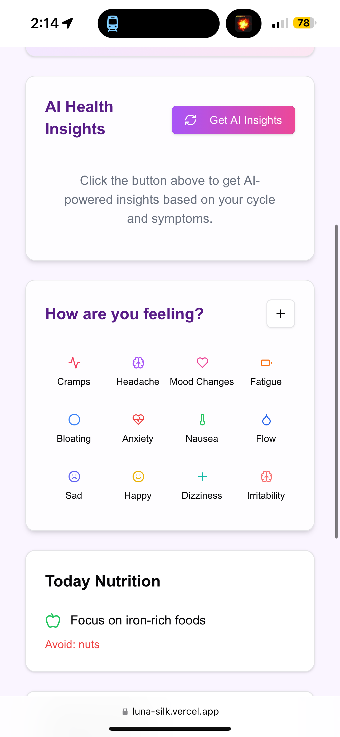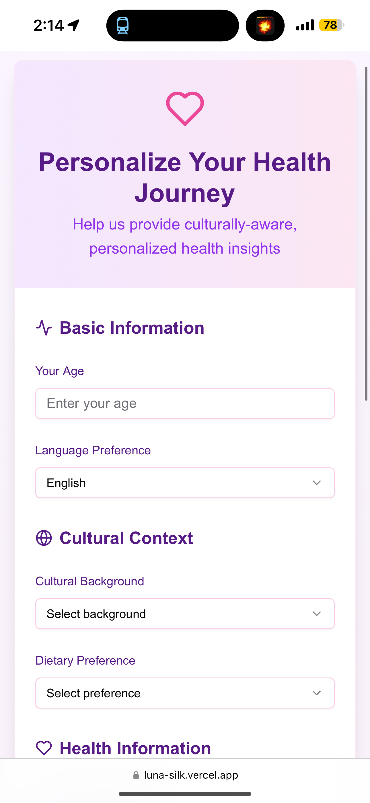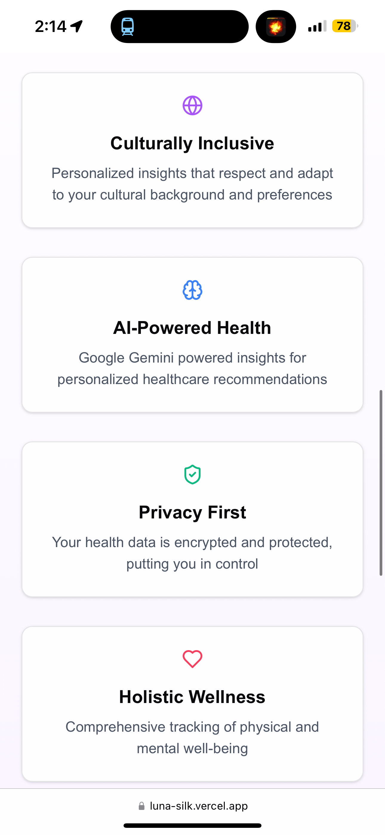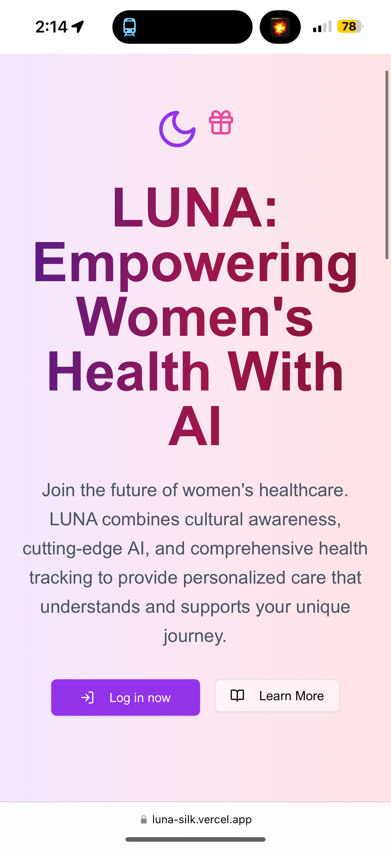 Built with Next.js and Vercel, LUNA integrates Google’s Gemini for personalized AI insights. With secure Google authentication, LUNA is designed to provide culturally-inclusive and encrypted data handling, ensuring privacy and security for each user’s health journey.