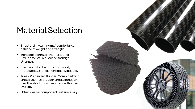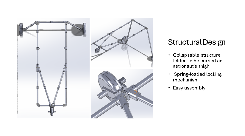 The main challenges we ran into is weight limit criteria of 50lbs for the overall system and locking the astronauts in a rigid position on the Litter. Another challenge we ran into was the design process as we had to go through 7 different design iterations.