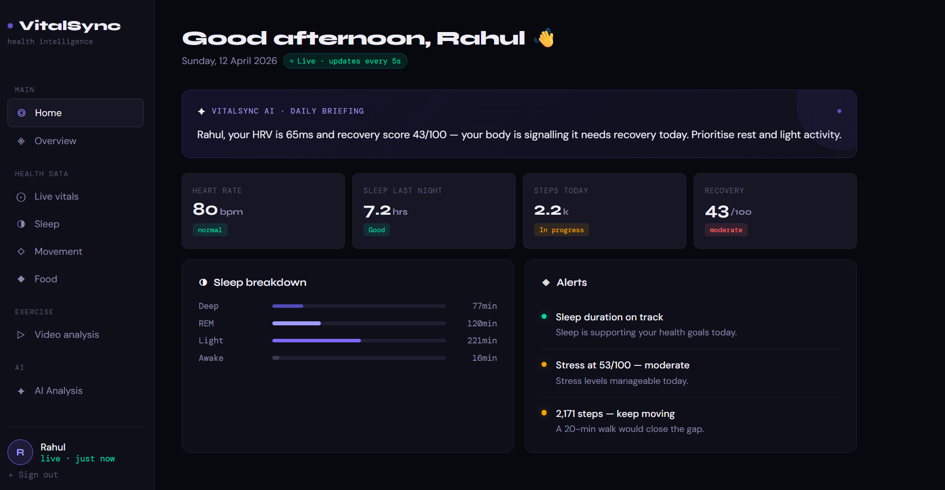 \noindent \textbf{VitalSync} is a privacy-first health dashboard that turns fragmented biometrics, workout analysis, and daily life context into one unified layer of health intelligence. Instead of showing users isolated charts and scores, VitalSync connects multiple health signals and translates them into personalized, actionable guidance.
