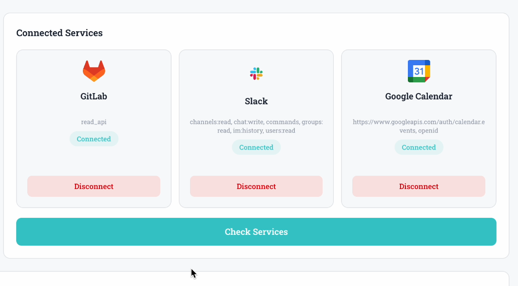 - Connected accounts (GitLab, Slack, Google Calendar)
