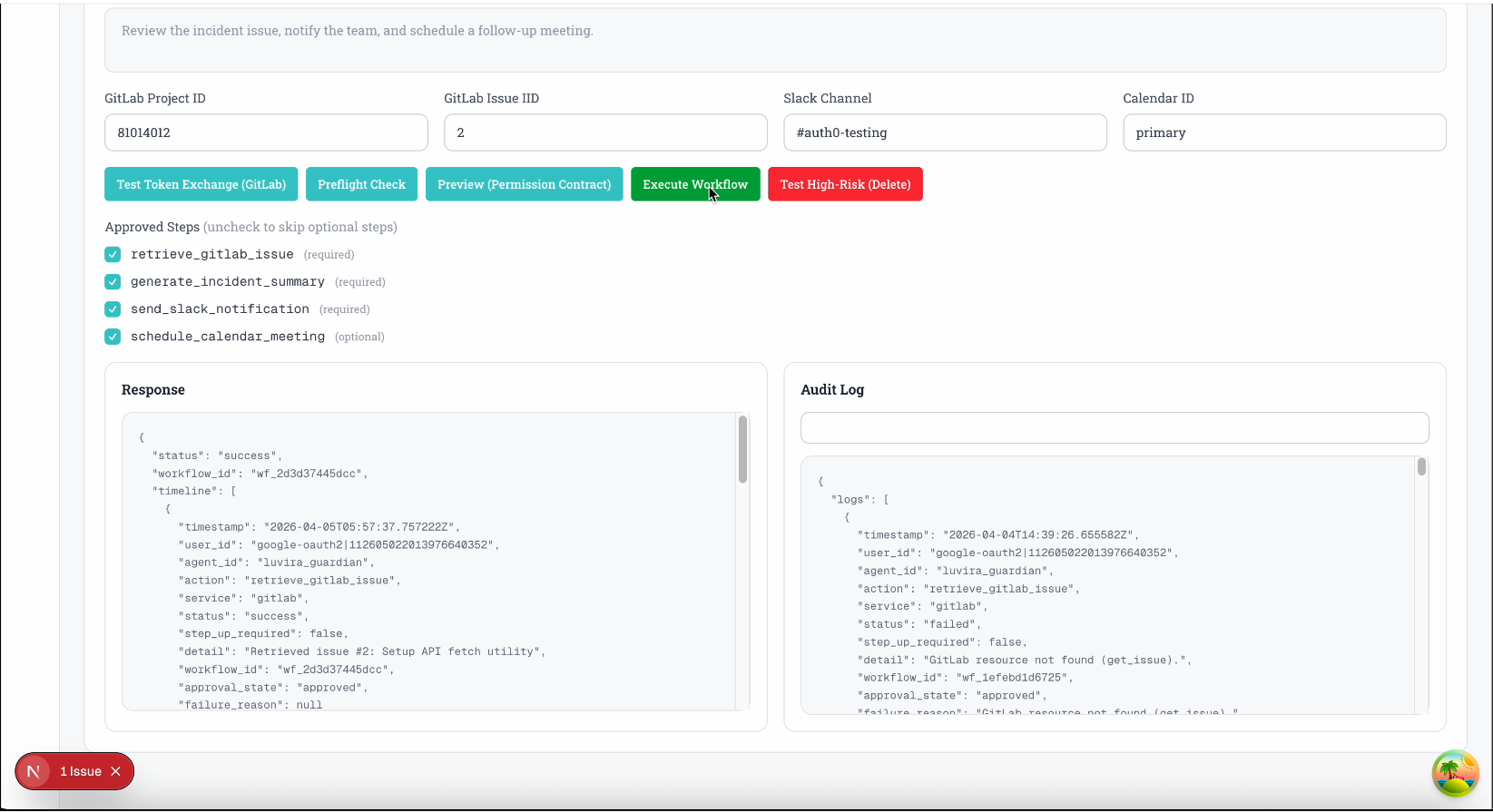 Luvira Guardian is a secure AI incident response agent that automates workflows across GitLab, Slack, and Google Calendar in under 60 seconds.